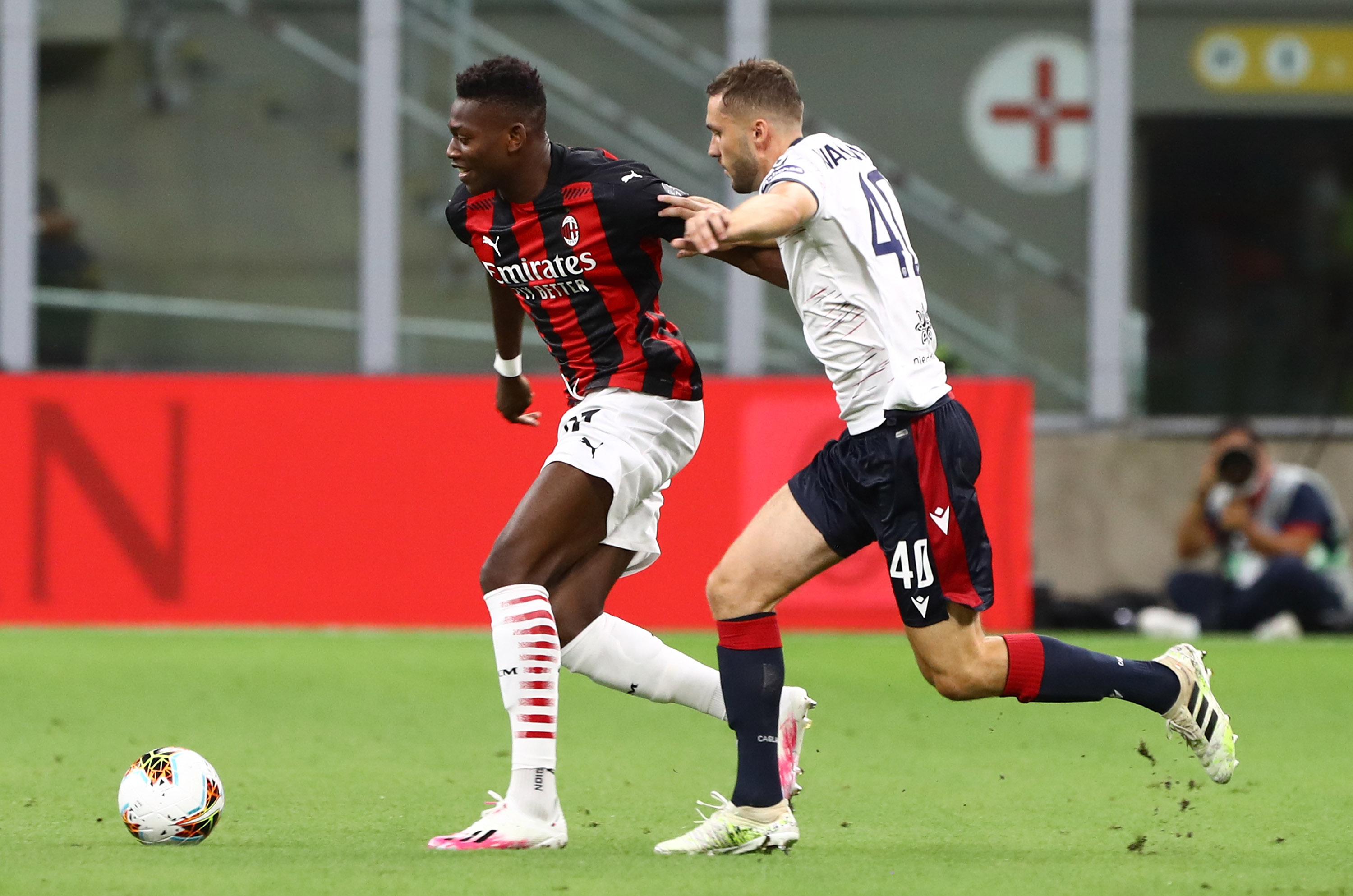 MILAN, ITALY - AUGUST 01: Rafael Leao of AC Milan competes for the ball with Sebastian Walukiewicz of Cagliari Calcio during the Serie A match between AC Milan and Cagliari Calcio at Stadio Giuseppe Meazza on August 1, 2020 in Milan, Italy. (Photo by Marco Luzzani/Getty Images)