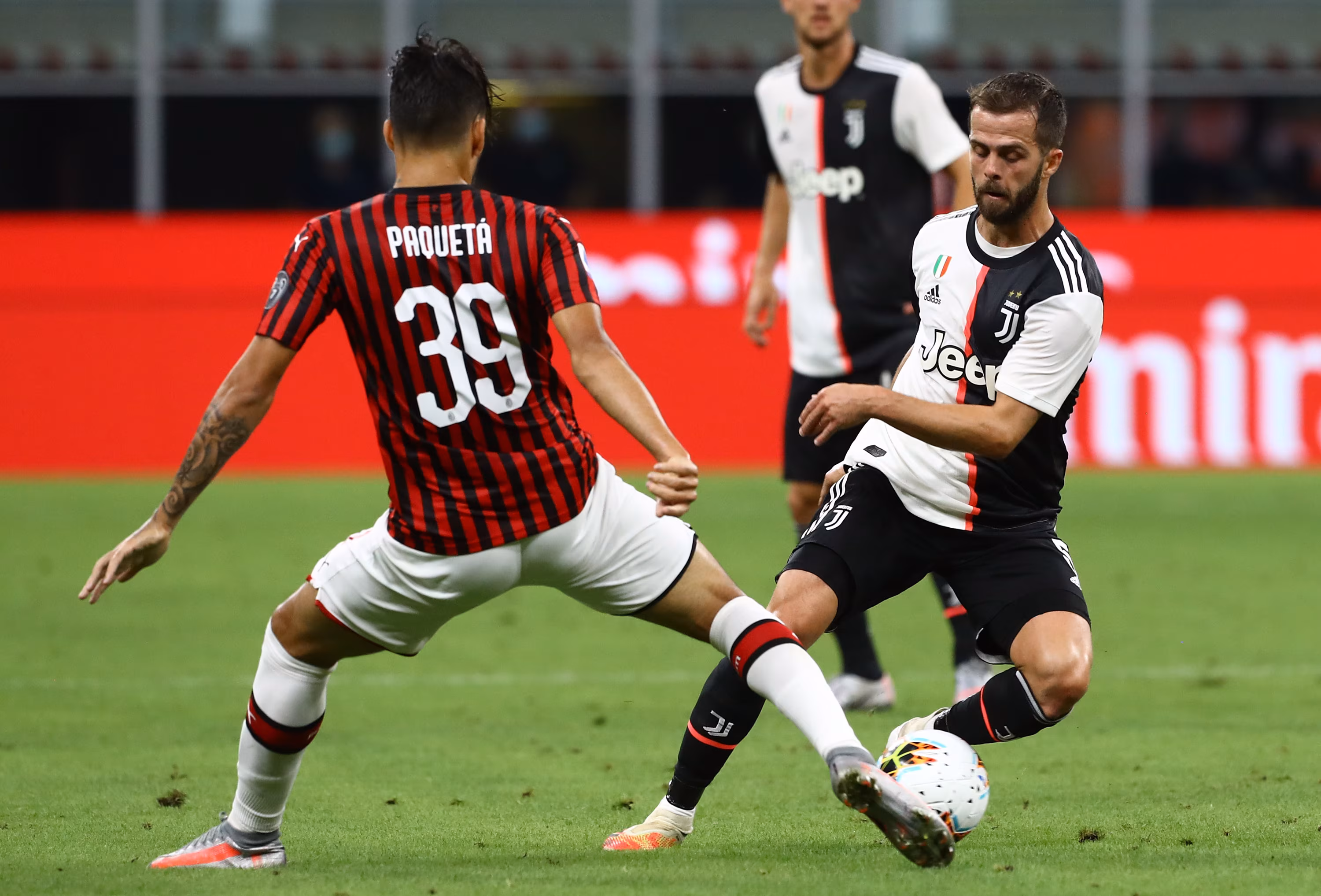 MILAN, ITALY - JULY 07: Miralem Pjanic (R) of Juventus FC competes for the ball with Lucas Paqueta (L) of AC Milan during the Serie A match between AC Milan and Juventus at Stadio Giuseppe Meazza on July 7, 2020 in Milan, Italy. (Photo by Marco Luzzani/Getty Images)
