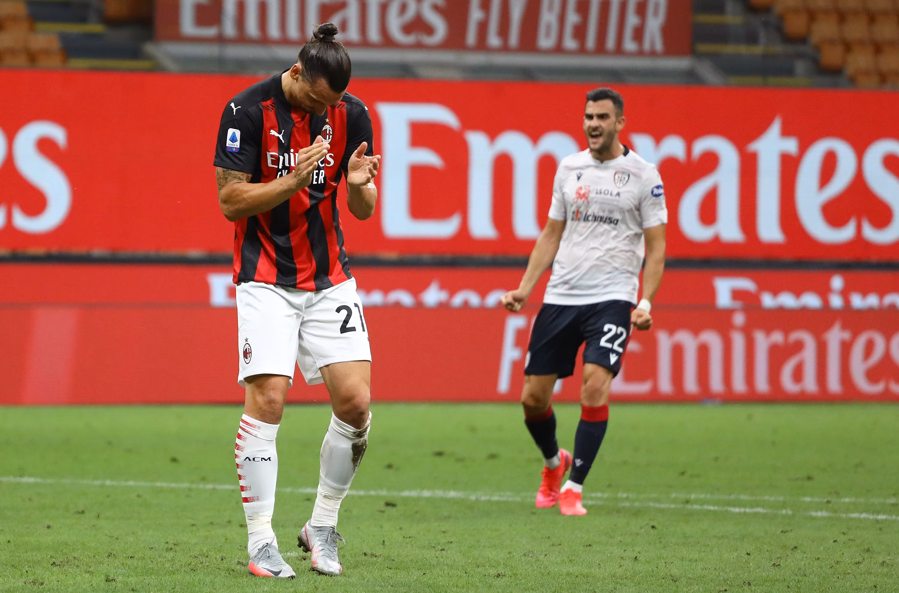 MILAN, ITALY - AUGUST 01: Zlatan Ibrahimovic of AC Milan reacts to a missed penalty during the Serie A match between AC Milan and Cagliari Calcio at Stadio Giuseppe Meazza on August 1, 2020 in Milan, Italy. (Photo by Marco Luzzani/Getty Images)