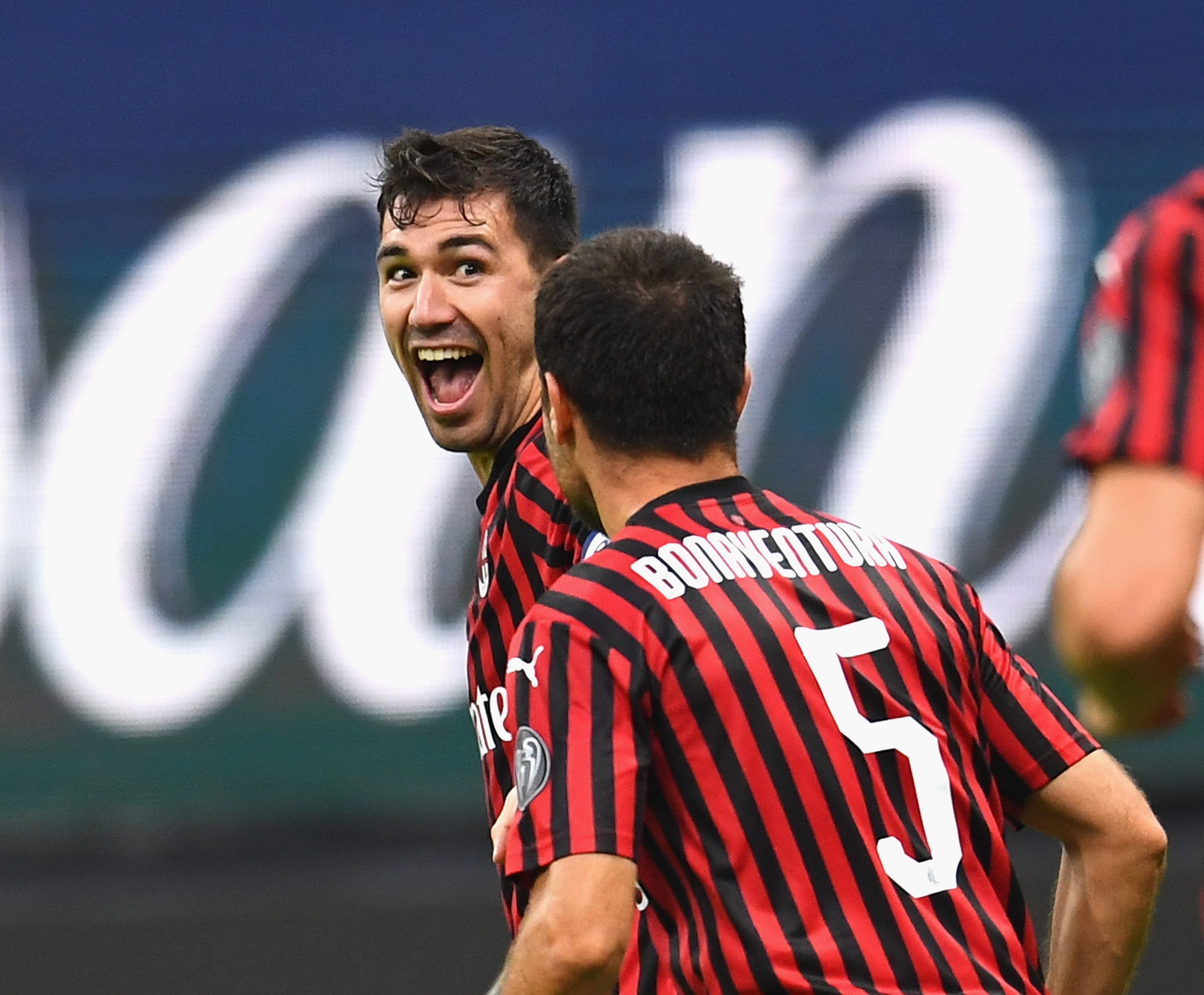 MILAN, ITALY - JULY 15: Alessio Romagnoli of AC Milan celebrates after scoring the second goal during the Serie A match between AC Milan and Parma Calcio at Stadio Giuseppe Meazza on July 15, 2020 in Milan, Italy. (Photo by Claudio Villa/Getty Images)