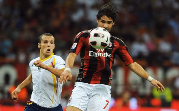 MILAN, ITALY - AUGUST 29: Pato of AC Milan competes for the ball with Djamel Mesbah of US Lecce during the Serie A match between AC Milan and US Lecce at Stadio Giuseppe Meazza on August 29, 2010 in Milan, Italy. (Photo by Valerio Pennicino/Getty Images)