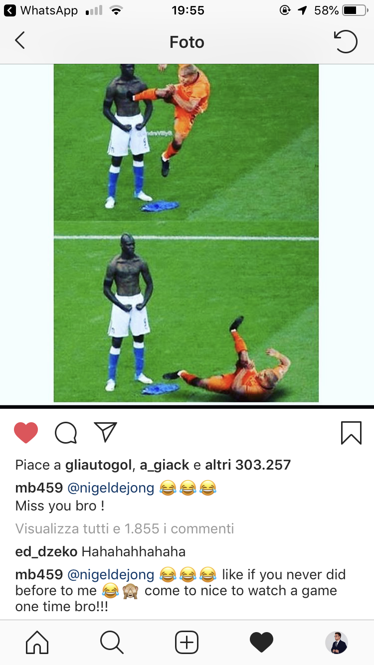 MILANO – Mario Balotelli stupisce sempre. L’attaccante del Nizza, quest’oggi, ha postato su Instagram una foto che lo ritrae nel momento della sua celebre esultanza in Italia-Germania agli Europei del 2012; ad affrontarlo, questa volta, c’è Nigel De Jong, con la sua altrettanto celebre entrata killer nella finale del Mondiale 2010. Il centrocampista olandese, però, nella foto, sbatte rovinosamente sul 9 azzurro.