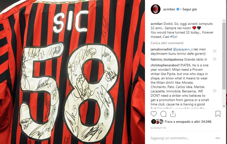 Laureatosi Campione del Mondo della classe 250 nel 2008, il “Sic” era riuscito a diventare uno dei protagonisti più noti e apprezzati della Moto Gp. Rimasto vittima di un tragico incidente in pista durante il Gran Premio della Malesia, che lo ha portato via a soli ventiquattro anni, Simoncelli non è stato dimenticato dal mondo dello sport. Il Milan infatti, sul proprio profilo Instagram, ha postato una foto con una maglia rossonera dedicata a lui.