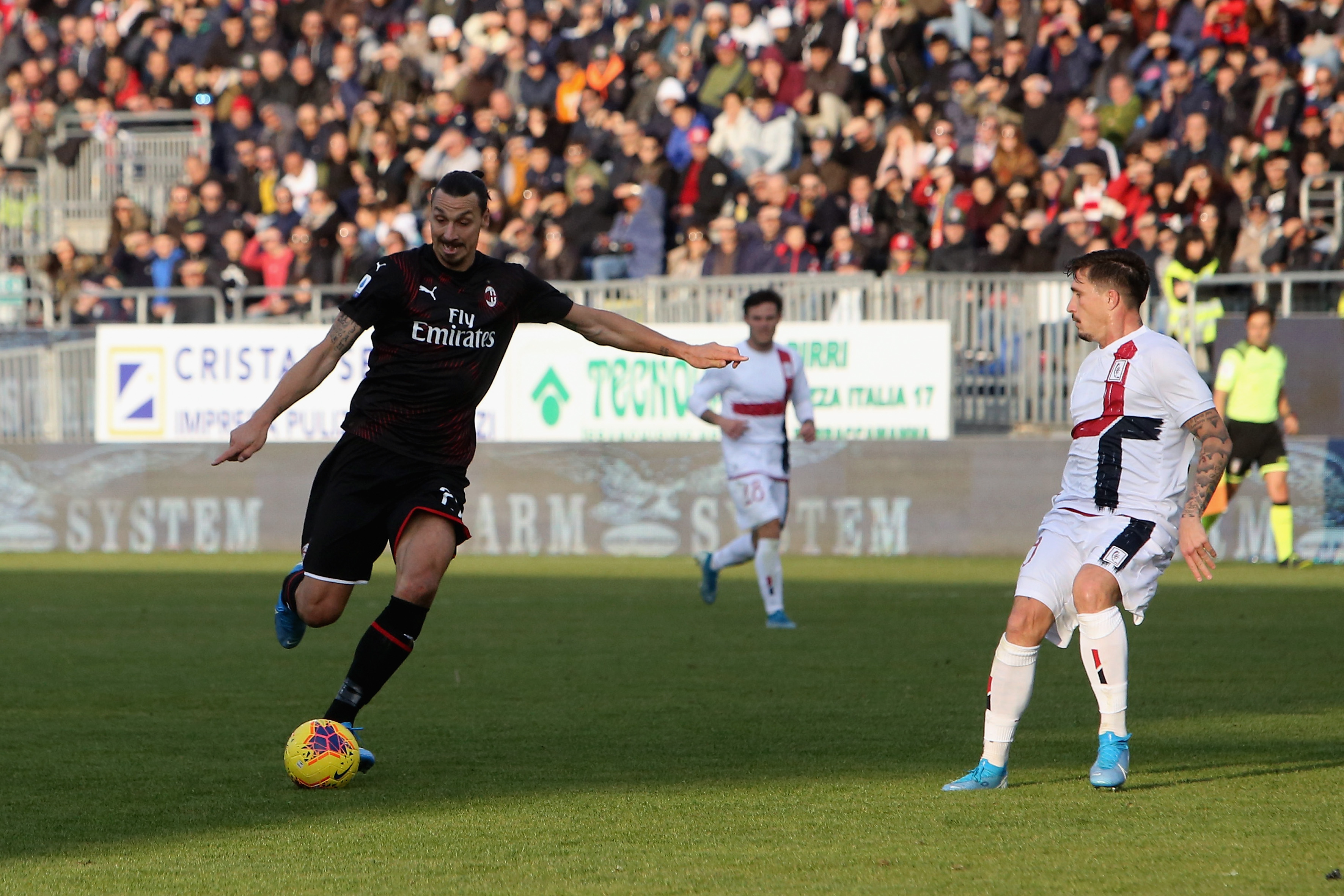 Zlatan Ibrahimovic, attaccante del Milan, calcia in quel di Cagliari sotto gli occhi di Pisacane.