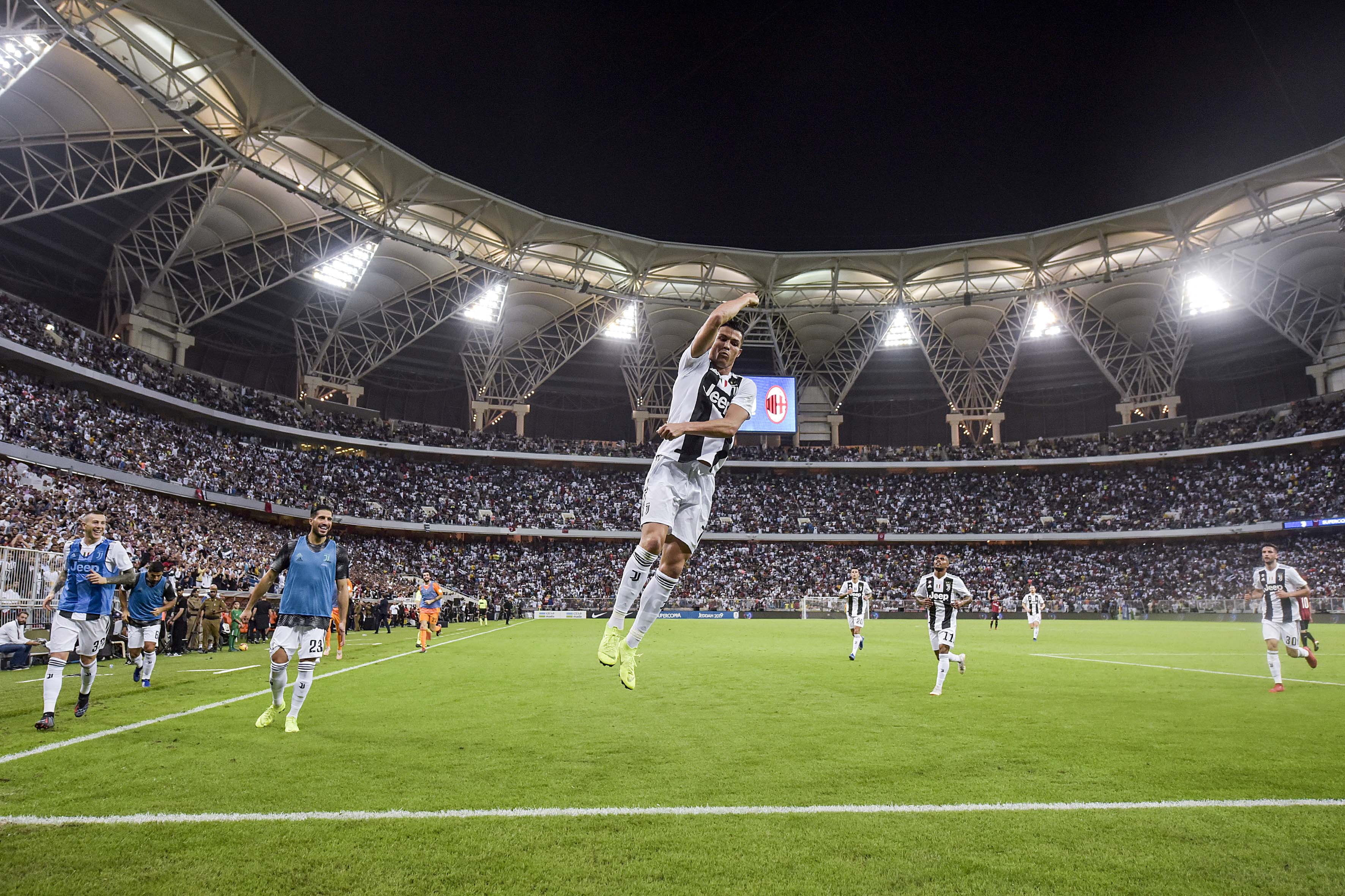 JEDDAH, SAUDI ARABIA - JANUARY 16: Cristiano Ronaldo of Juventus celebrates his opening goal (1-0) during the Italian Supercup match between Juventus and AC Milan at King Abdullah Sports City on January 16, 2019 in Jeddah, Saudi Arabia. (Photo by Daniele Badolato - Juventus FC/Juventus FC via Getty Images)