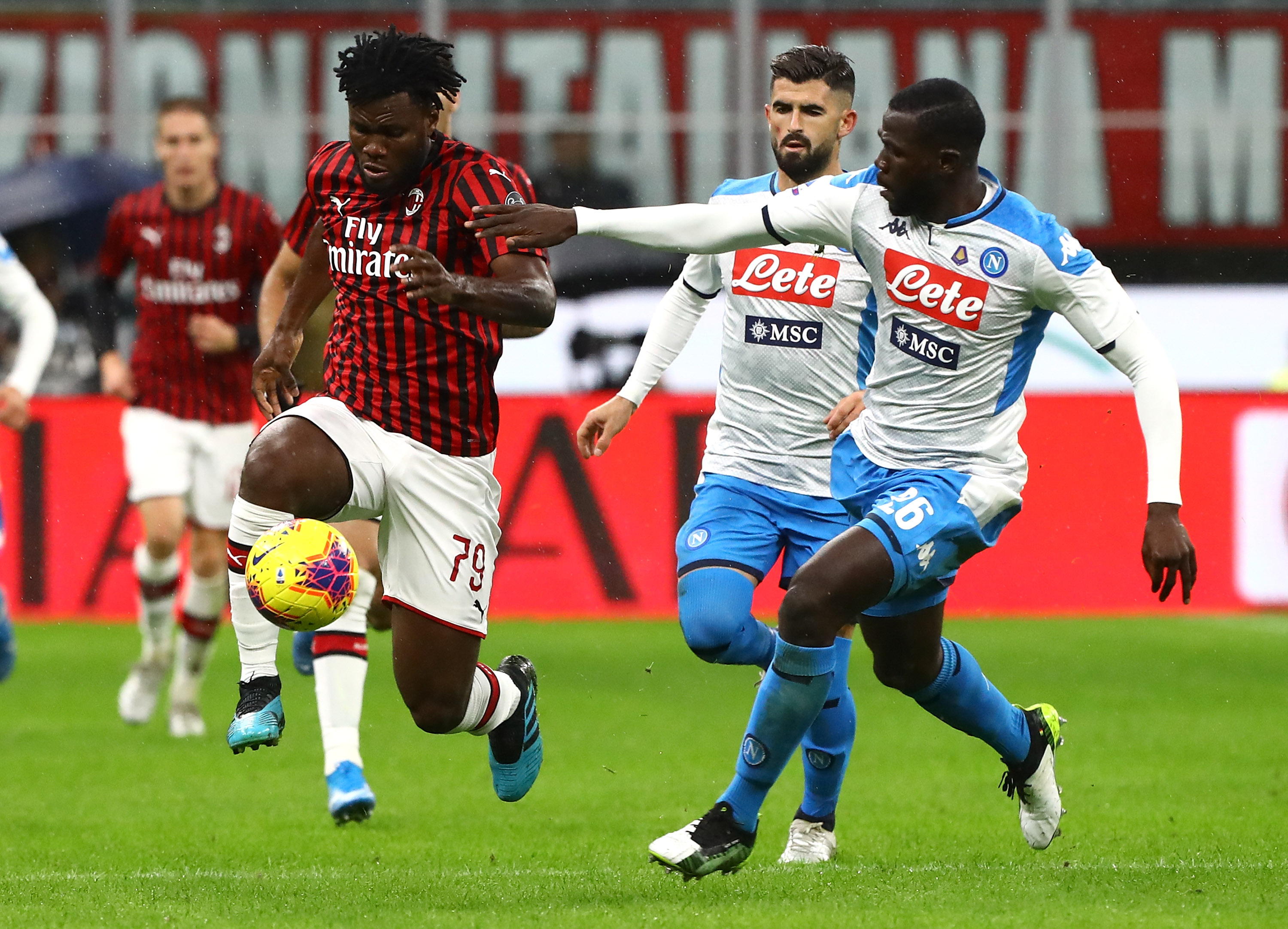 MILAN, ITALY - NOVEMBER 23: Franck Kessie of AC Milan competes for the ball with Kalidou Koulibaly of SSC Napoli during the Serie A match between AC Milan and SSC Napoli at Stadio Giuseppe Meazza on November 23, 2019 in Milan, Italy. (Photo by Marco Luzzani/Getty Images)