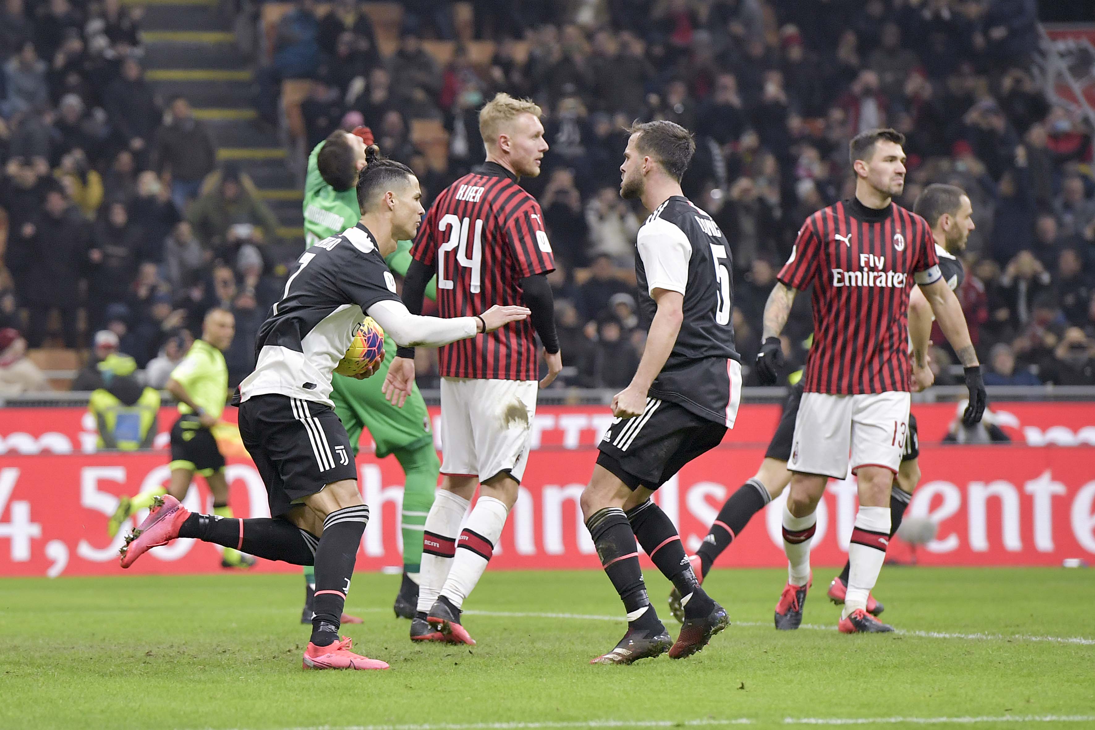 MILAN, ITALY - FEBRUARY 13: Cristiano Ronaldo of Juventus celebrates after scoring the penalty kick (1-1) with his teammate Miralem Pjanic during the Coppa Italia Semi Final match between AC Milan and Juventus at Stadio Giuseppe Meazza on February 13, 2020 in Milan, Italy. (Photo by Daniele Badolato - Juventus FC/Juventus FC via Getty Images)
