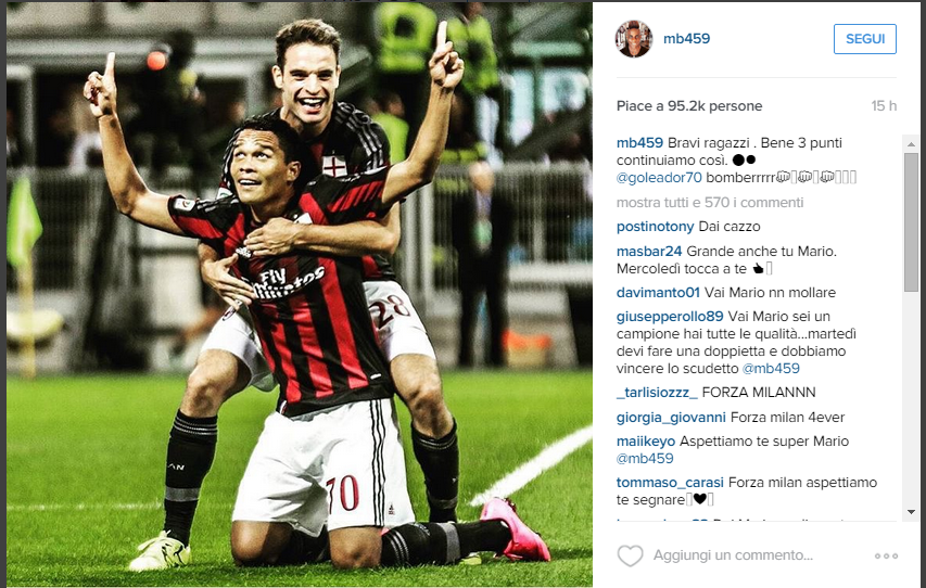 GRUPPO - Ieri non è entrato con lo stesso piglio del Derby, ma il momento era diverso e nonostante tutto Mario Balotelli, tenendo palla alta e sacrificandosi per il gruppo, ha dimostrato per l'ennesima volta di essere tornato al Milan con ben altra motivazione. Si vede anche nel suo rapporto con i compagni, molto più genuino ed espansivo rispetto al passato - nonostante si ricordino grandi amicizie come quella con Boateng. Questa mattina ha voluto festeggiare a modo suo la grandissima prestazione di Bacca e Bonaventura riservandogli complimenti e parole importanti su Instagram: "Bravi ragazzi, bene i tre punti", con una bellissima foto dei due giocatori durante l'esultanza.