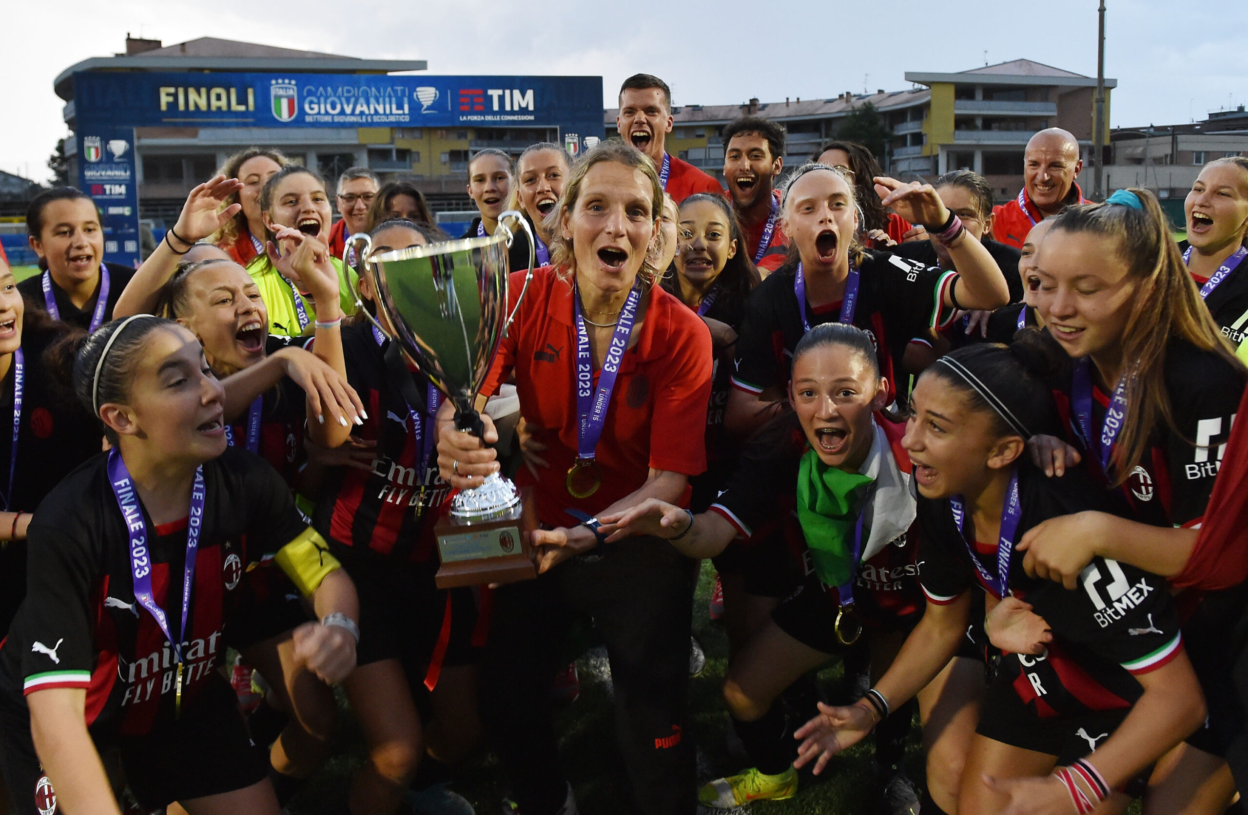 SENIGALLIA, ITALY - JUNE 30: Ilenia Prati head coach of AC Milan celebrates the victory after the Women U15 Final match between FC Internazionale and AC Milan at Stadio Goffredo Bianchelli on June 30, 2023 in Senigallia, Italy. (Photo by Giuseppe Bellini/Getty Images)
