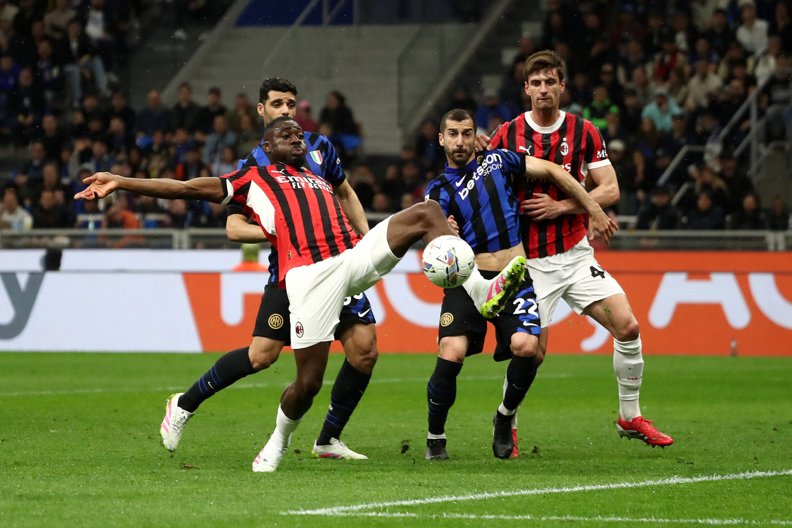 MILAN, ITALY - APRIL 23: Youssouf Fofana of AC Milan controls the ball under pressure from Henrikh Mkhitaryan of FC Internazionale during the coppa Italia Semi Final match between FC Internazionale and AC Milan at Stadio Giuseppe Meazza on April 23, 2025 in Milan, Italy. (Photo by Marco Luzzani/Getty Images)