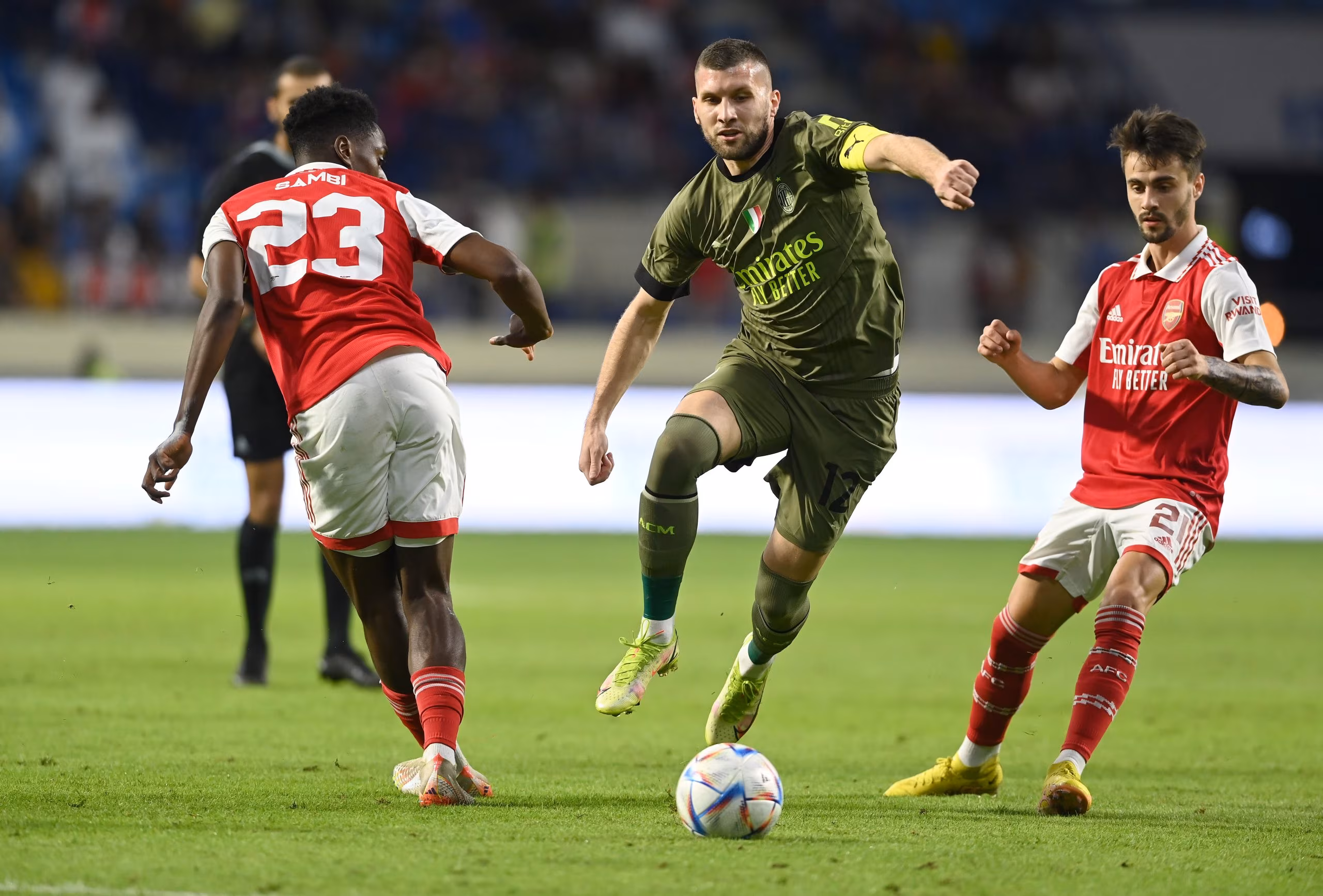 DUBAI, UNITED ARAB EMIRATES - DECEMBER 13: Ante Rebic of AC Milan competes for the ball with Sambi Lokonga of Arsenal during the Dubai Super Cup match between Arsenal and AC Milan at Al Maktoum Stadium on December 13, 2022 in Dubai, United Arab Emirates. (Photo by Claudio Villa/AC Milan via Getty Images)