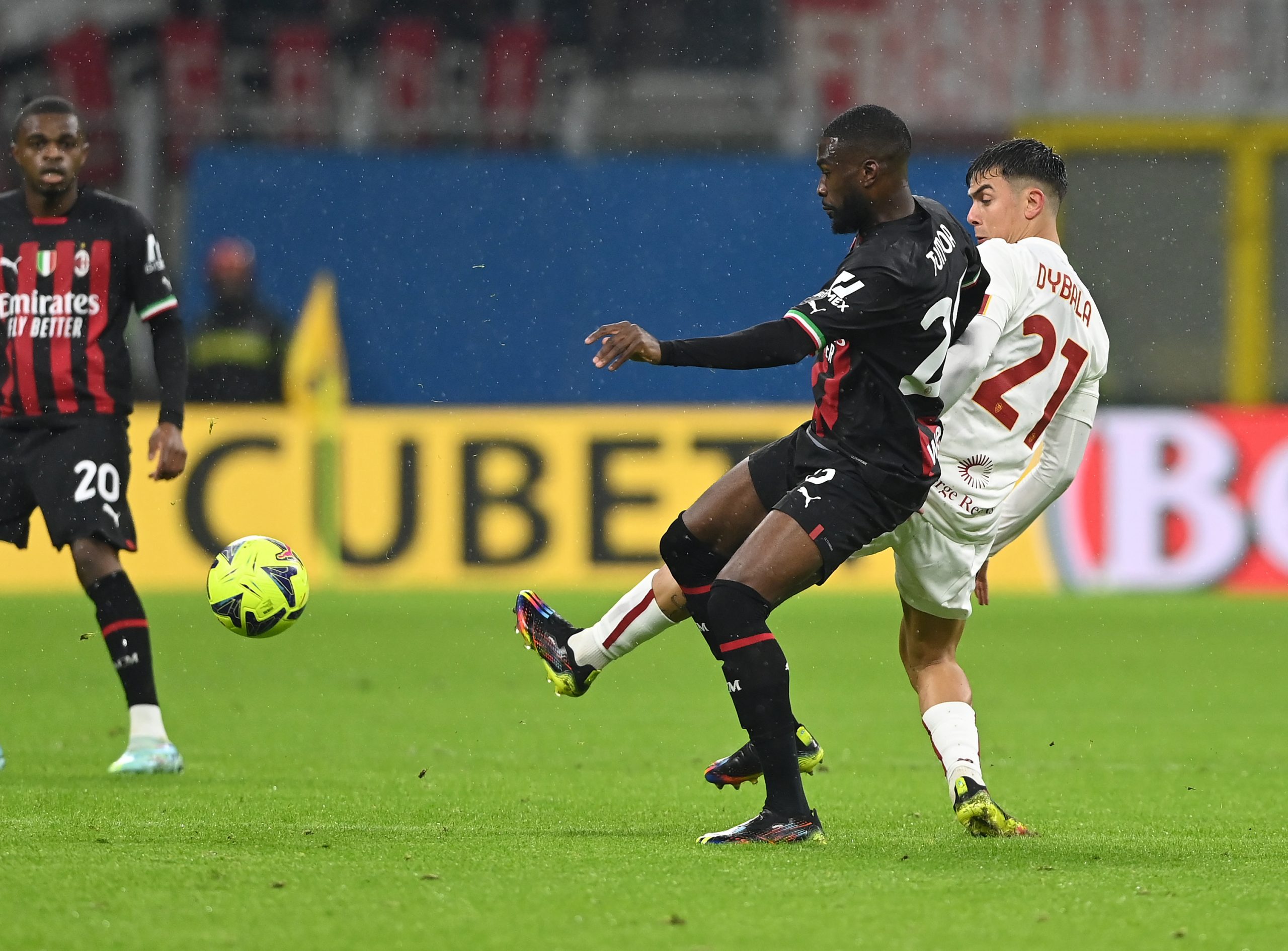 MILAN, ITALY - JANUARY 08: Fikayo Tomori of AC Milan competes for the ball with Paulo Dybala of AS Roma during the Serie A match between AC MIlan and AS Roma at Stadio Giuseppe Meazza on January 08, 2023 in Milan, Italy. (Photo by Claudio Villa/AC Milan via Getty Images)