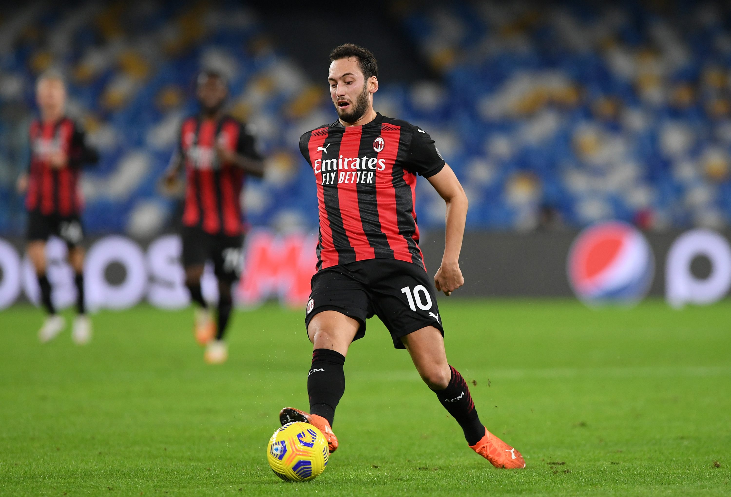 NAPLES, ITALY - NOVEMBER 22: Hakan Calhanoglu of AC Milan during the Serie A match between SSC Napoli and AC Milan at Stadio San Paolo on November 22, 2020 in Naples, Italy. (Photo by Francesco Pecoraro/Getty Images)