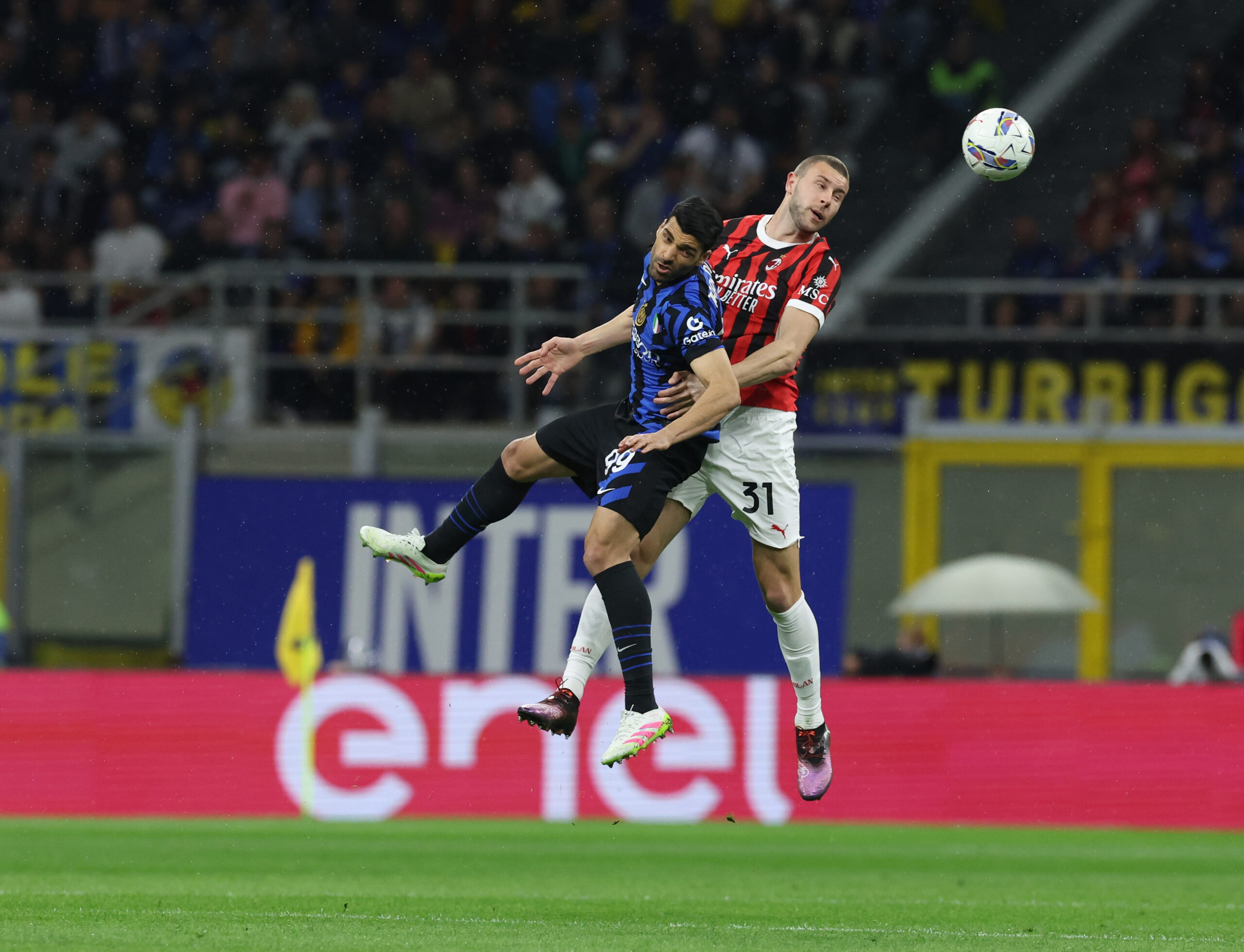 MILAN, ITALY - APRIL 23: Strahinja Pavlovic of AC Milan competes for the ball with Mehdi Taremi of FC Internazionale during the Coppa Italia Semi Final match between FC Internazionale and AC Milan at Stadio Giuseppe Meazza on April 23, 2025 in Milan, Italy. (Photo by Claudio Villa/AC Milan via Getty Images)