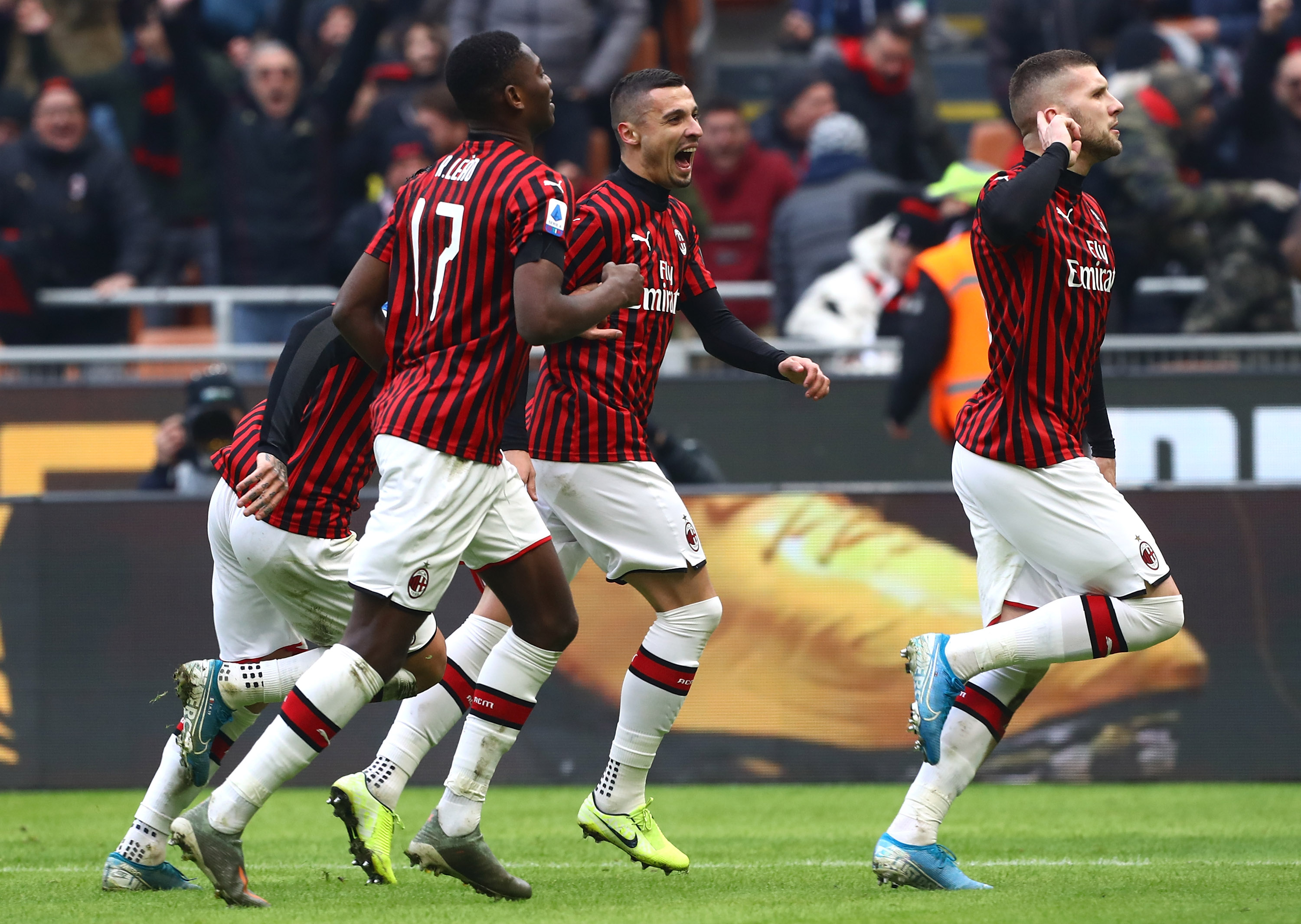 Ante Rebic, attaccante del Milan, festeggiato dai suoi compagni a San Siro.
