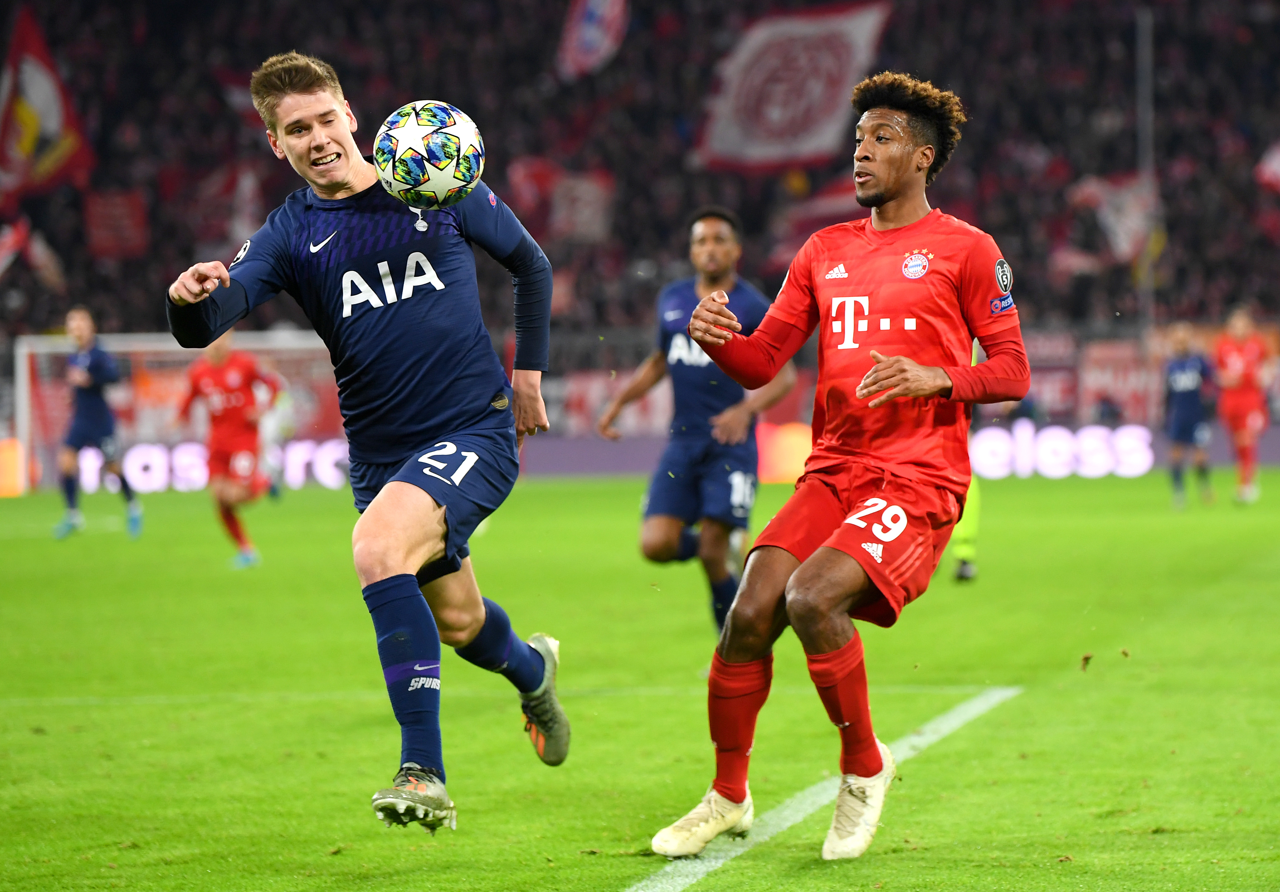 Juan Foyth, centrale del Tottenham, contrasta Coman del Bayern Monaco in Champions League.