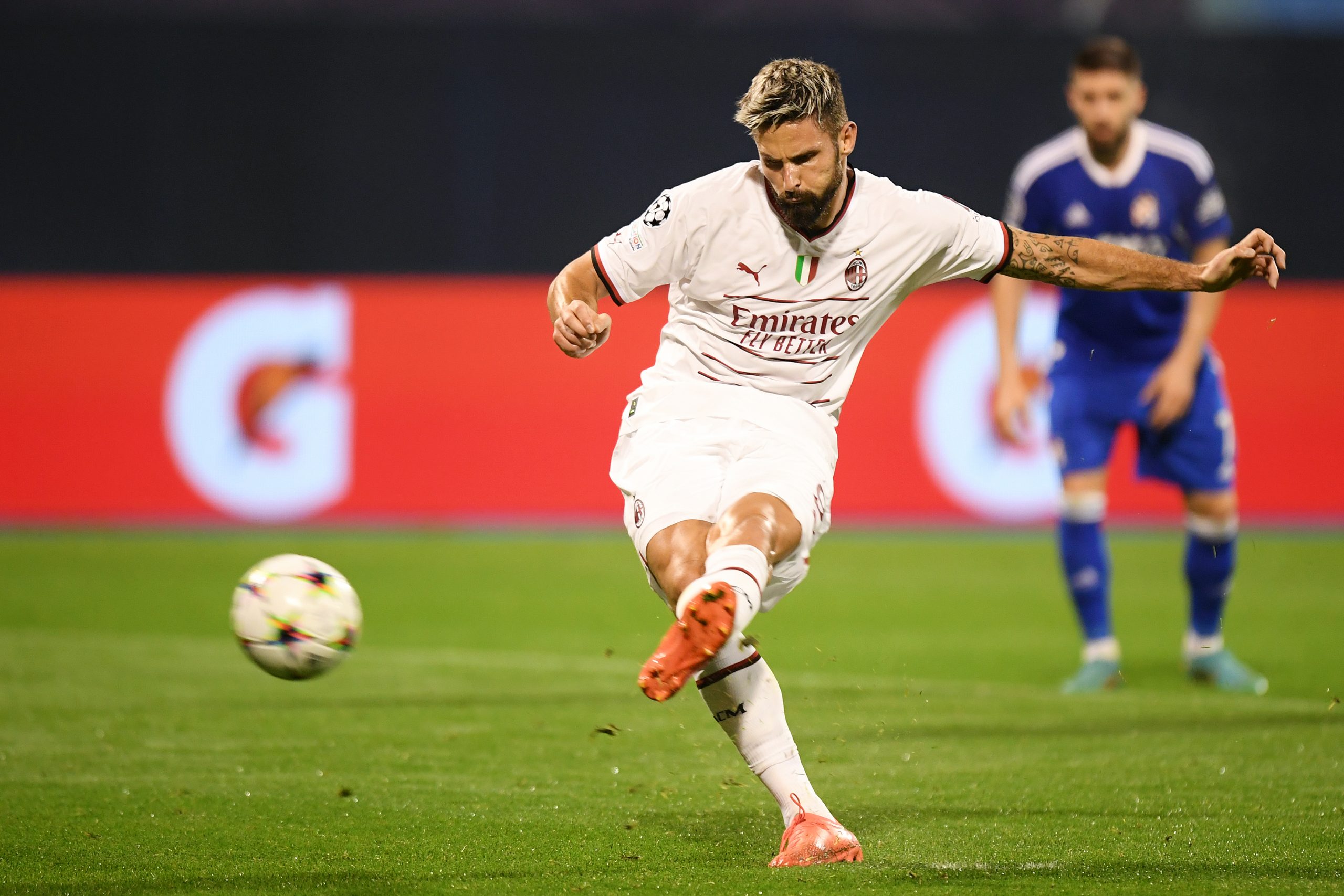 ZAGREB, CROATIA - OCTOBER 25: Olivier Giroud of AC Milan scores their side's third goal from a penalty during the UEFA Champions League group E match between Dinamo Zagreb and AC Milan at Stadion Maksimir on October 25, 2022 in Zagreb, Croatia. (Photo by Jurij Kodrun/Getty Images)