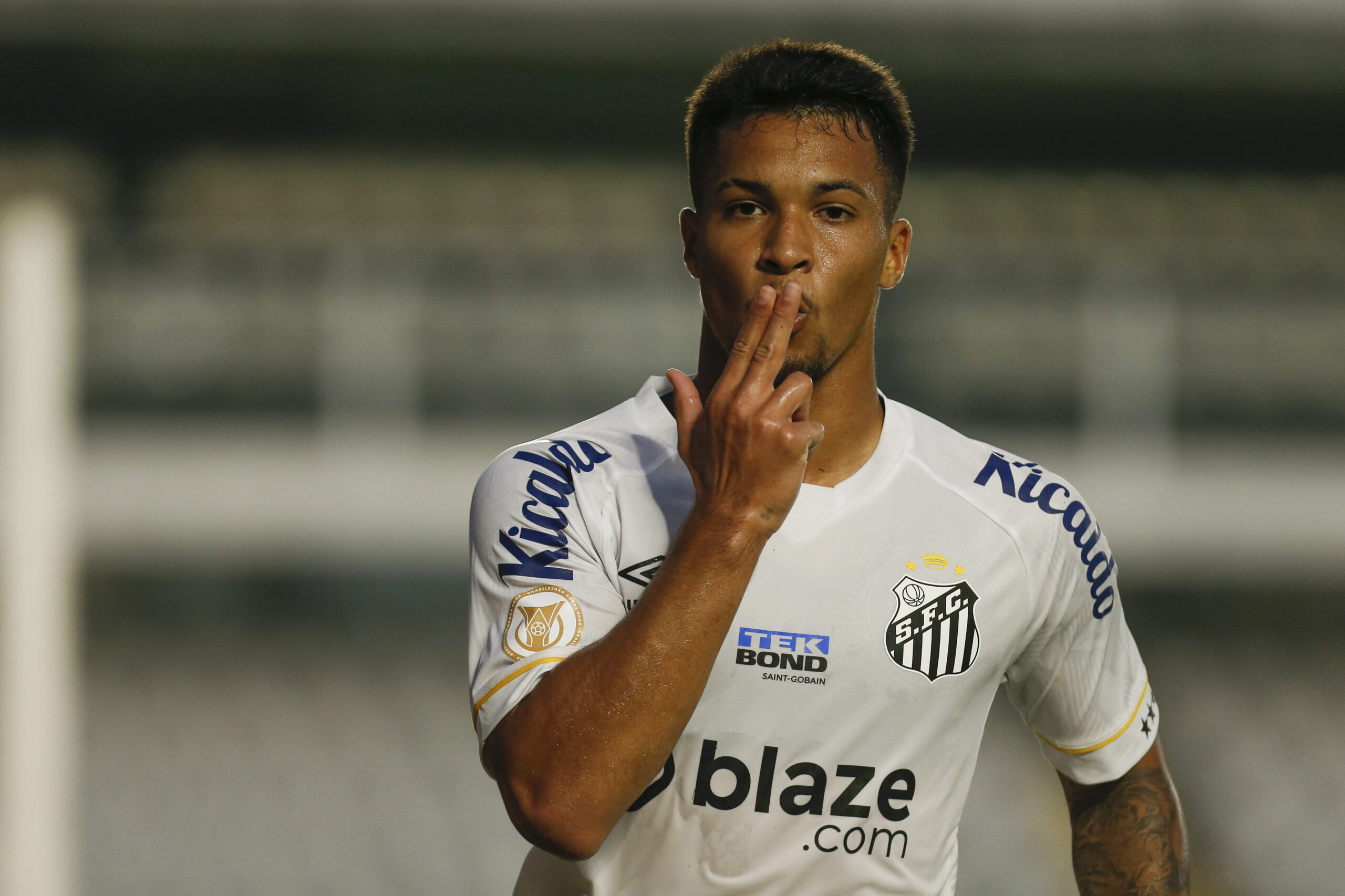 SANTOS, BRAZIL - JULY 23: Marcos Leonardo of Santos celebrates after scoring the team's second goal during the match between Santos and Botafogo as part of Brasileirao Series A 2023 at Urbano Caldeira Stadium (Vila Belmiro) on July 23, 2023 in Santos, Brazil. (Photo by Ricardo Moreira/Getty Images)