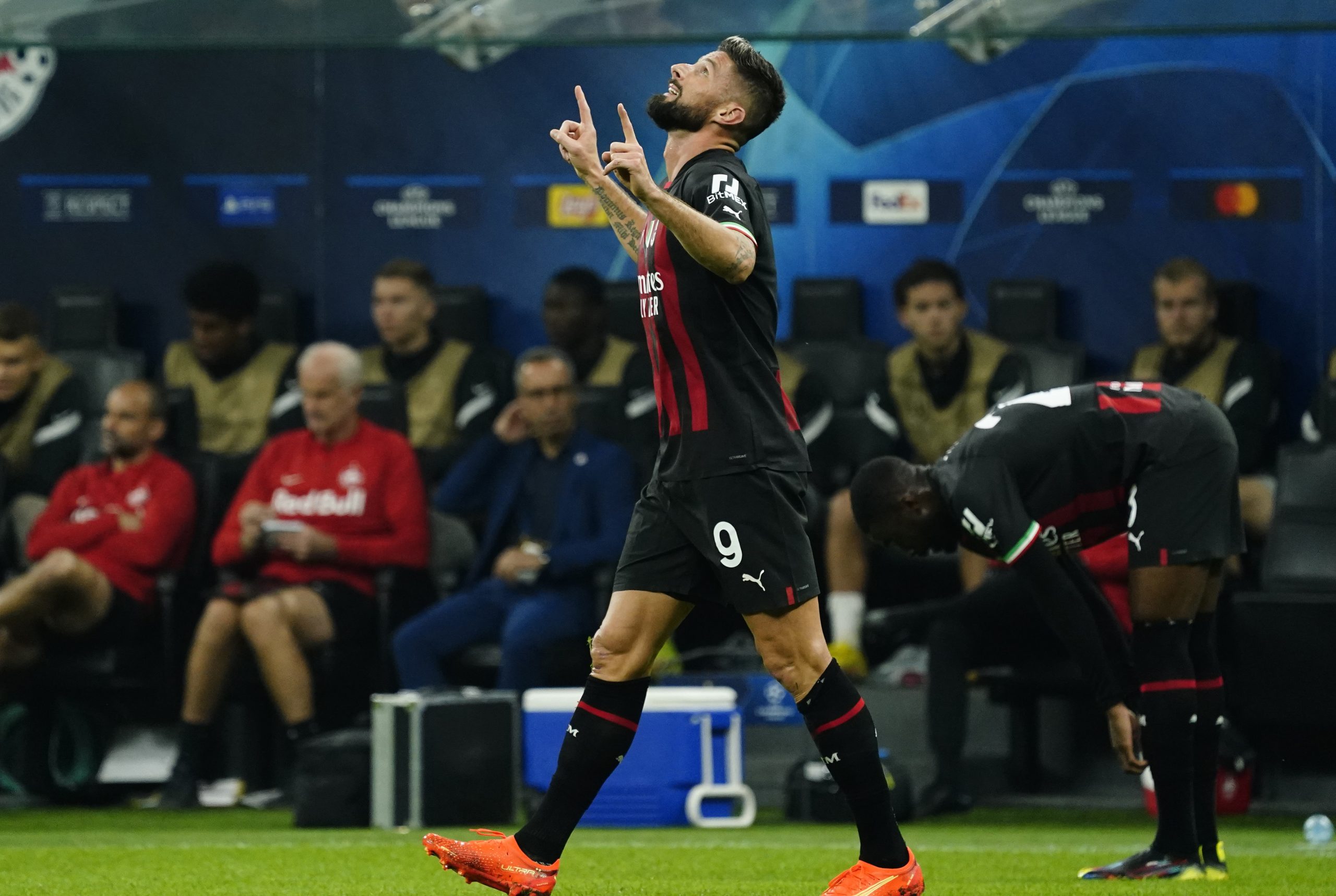 MILAN, ITALY - NOVEMBER 02: Olivier Giroud of AC Milan celebrates after scoring his team's first goal during the UEFA Champions League group E match between AC Milan and FC Salzburg at Giuseppe Meazza Stadium on November 02, 2022 in Milan, Italy. (Photo by Pier Marco Tacca/AC Milan via Getty Images)
