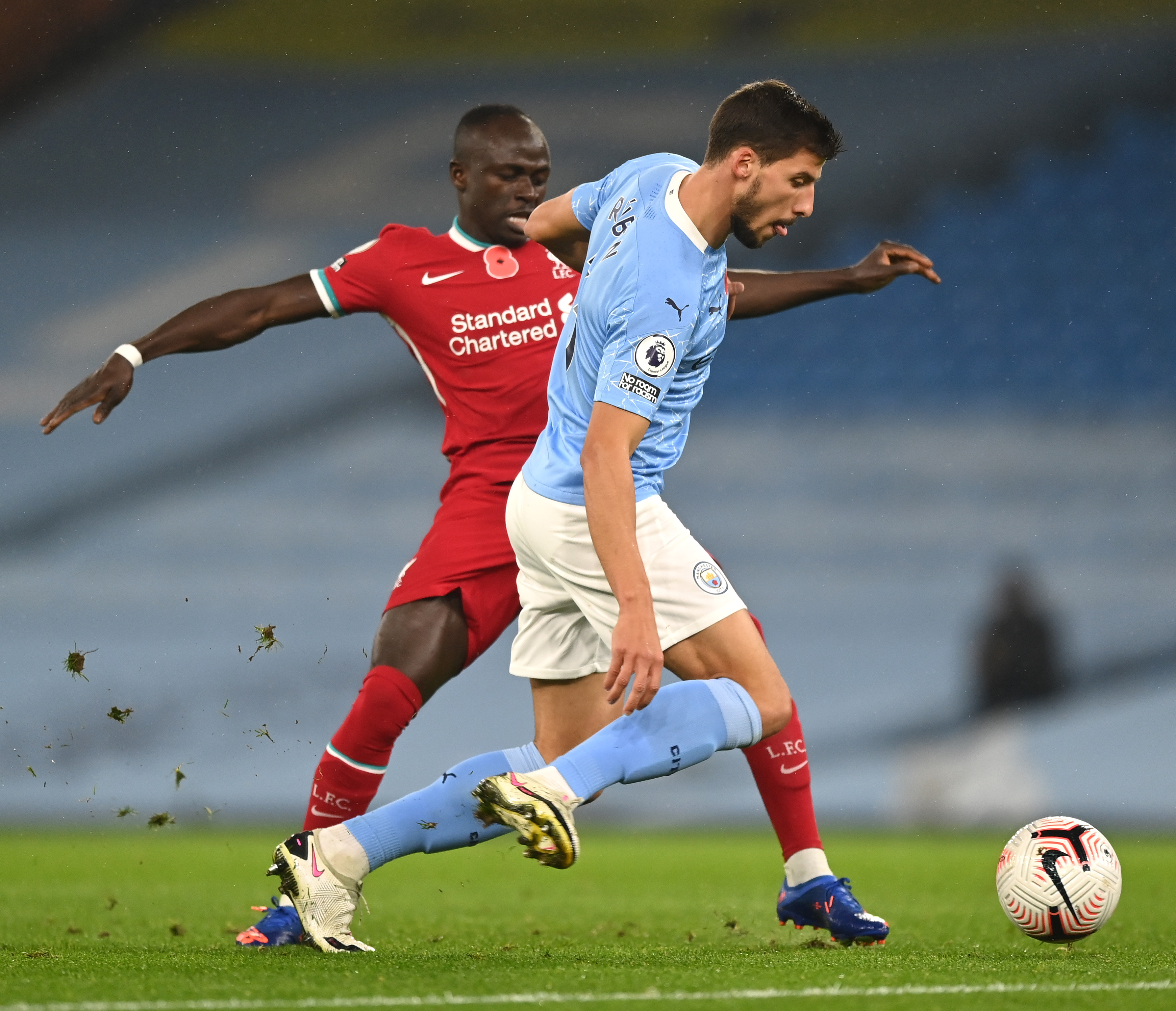 MANCHESTER, ENGLAND - NOVEMBER 08: Ruben Dias of Manchester City is challenged by Sadio Mane of Liverpool during the Premier League match between Manchester City and Liverpool at Etihad Stadium on November 08, 2020 in Manchester, England. Sporting stadiums around the UK remain under strict restrictions due to the Coronavirus Pandemic as Government social distancing laws prohibit fans inside venues resulting in games being played behind closed doors. (Photo by Shaun Botterill/Getty Images)