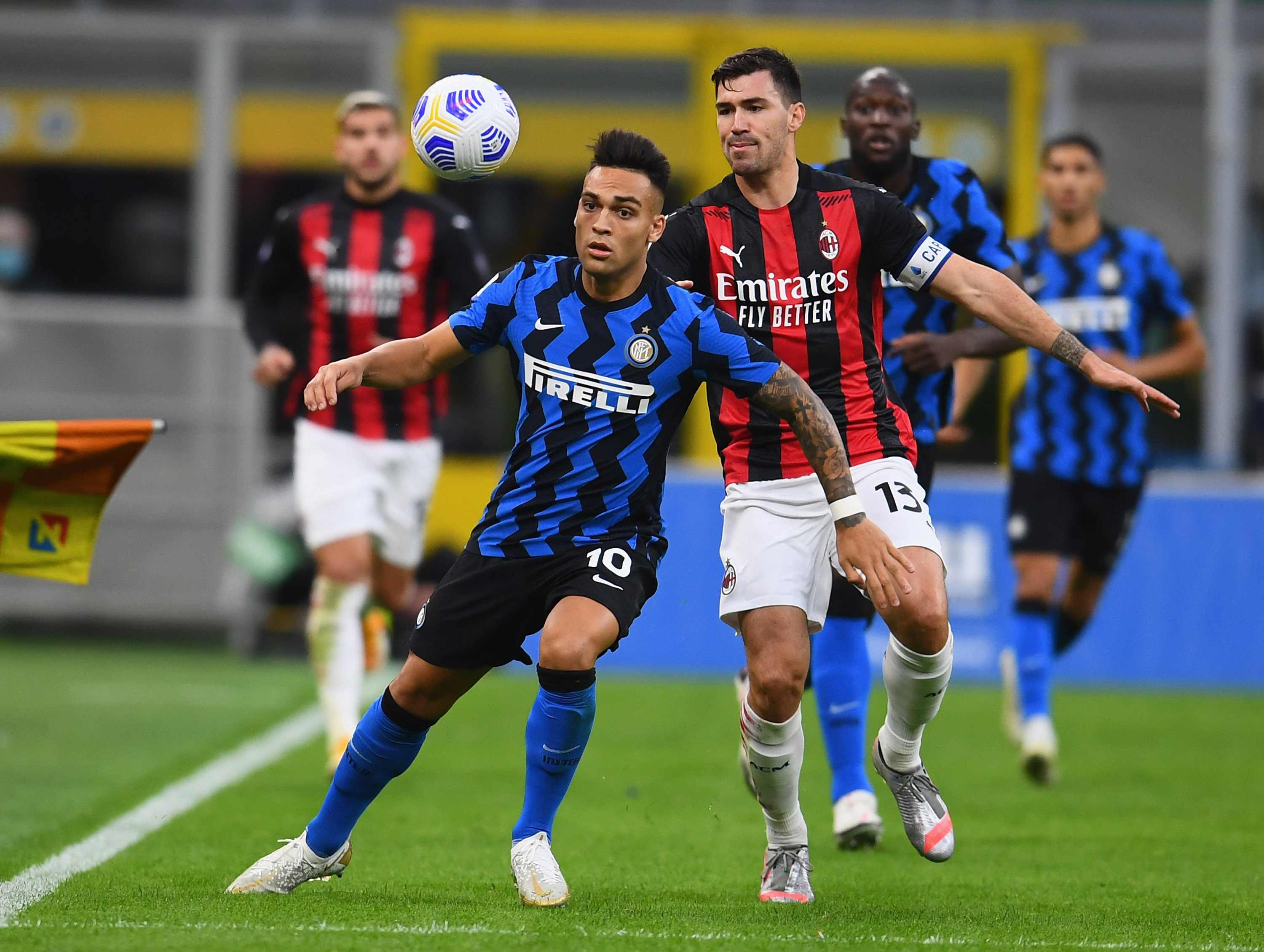 MILAN, ITALY - OCTOBER 17: Lautaro Martinez of FC Internazionale competes for the ball with Alessio Romagnoli of AC Milan during the Serie A match between FC Internazionale and AC Milan at Stadio Giuseppe Meazza on October 17, 2020 in Milan, Italy. (Photo by Claudio Villa - Inter/Inter via Getty Images)