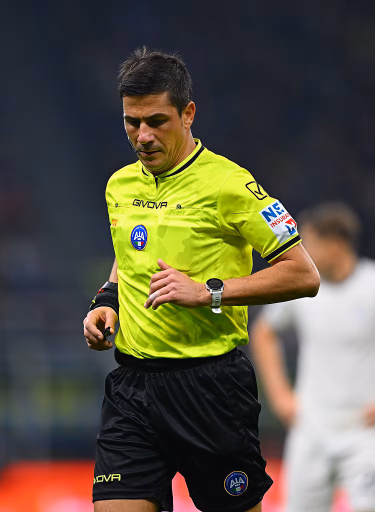 MILAN, ITALY - NOVEMBER 09: Referee Gianluca Manganiello reacts during the Serie A match between FC Internazionale and SS Lazio at Giuseppe Meazza Stadium on November 09, 2025 in Milan, Italy. (Photo by Mattia Pistoia - Inter/Inter via Getty Images)