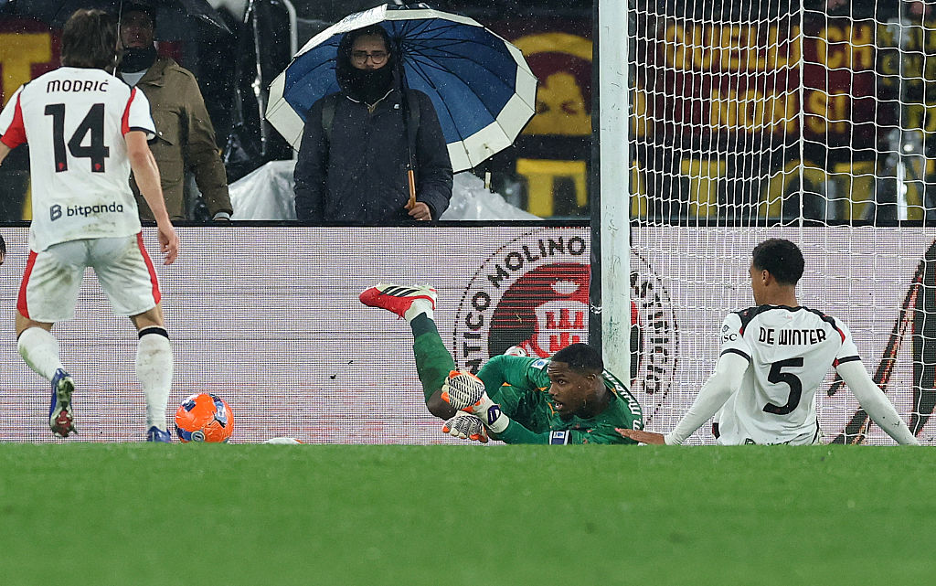 ROME, ITALY - JANUARY 25: Mike Maignan of AC Milan in action during the Serie A match between AS Roma and AC Milan at Stadio Olimpico on January 25, 2026 in Rome, Italy. (Photo by Claudio Villa/AC Milan via Getty Images)