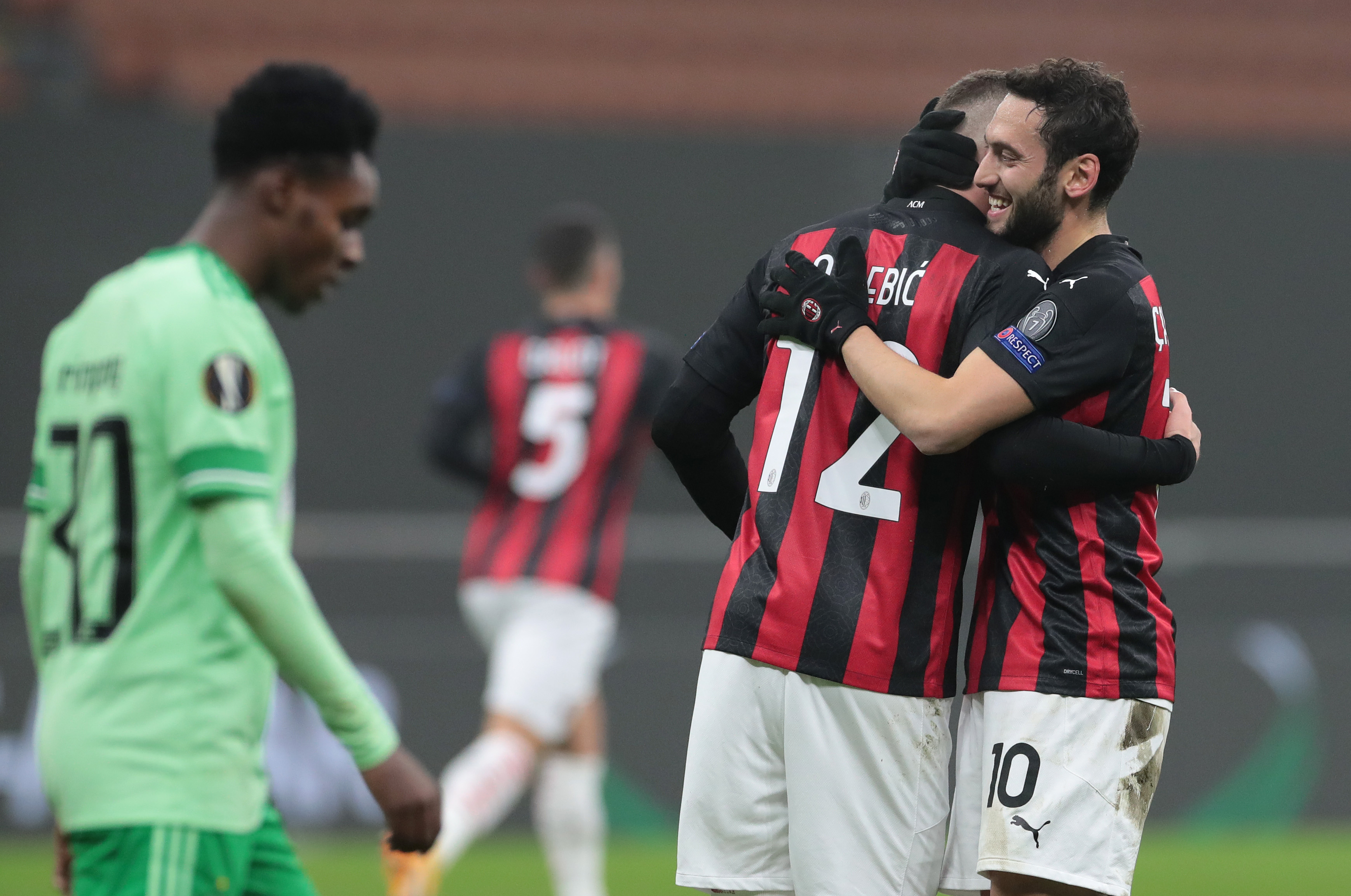 MILAN, ITALY - DECEMBER 03: Hakan Calhanoglu of A.C. Milan celebrates with Ante Rebic after scoring their team's first goal during the UEFA Europa League Group H stage match between AC Milan and Celtic at San Siro Stadium on December 03, 2020 in Milan, Italy. Sporting stadiums around Italy remain under strict restrictions due to the Coronavirus Pandemic as Government social distancing laws prohibit fans inside venues resulting in games being played behind closed doors. (Photo by Emilio Andreoli/Getty Images)