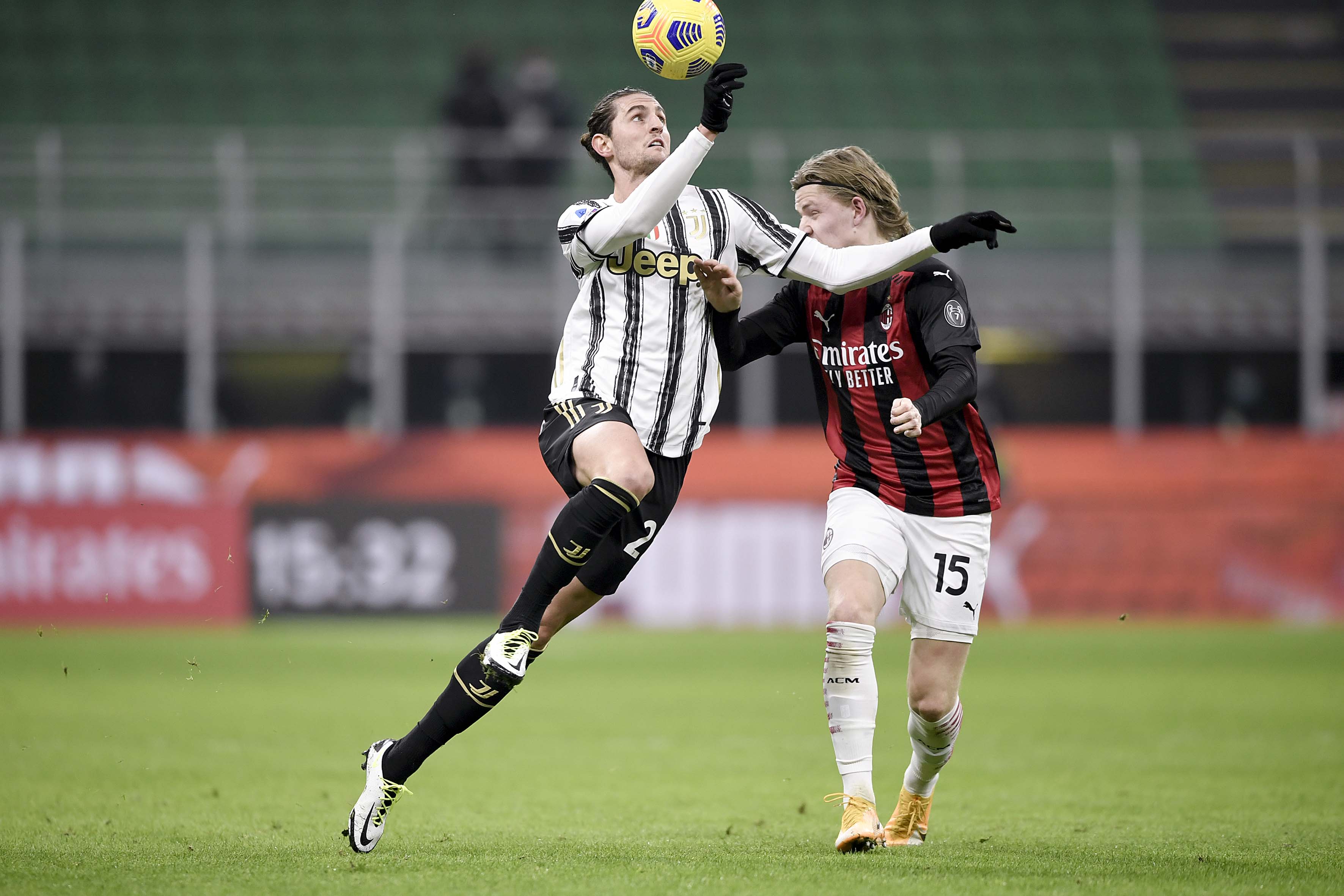 MILAN, ITALY - JANUARY 06: Adrien Rabiot of Juventus fights for the ball with Jens Petter Hauge of AC Milan during the Serie A match between AC Milan and Juventus at Stadio Giuseppe Meazza on January 06, 2021 in Milan, Italy. Sporting stadiums around Italy remain under strict restrictions due to the Coronavirus Pandemic as Government social distancing laws prohibit fans inside venues resulting in games being played behind closed doors. (Photo by Daniele Badolato - Juventus FC/Juventus FC via Getty Images)