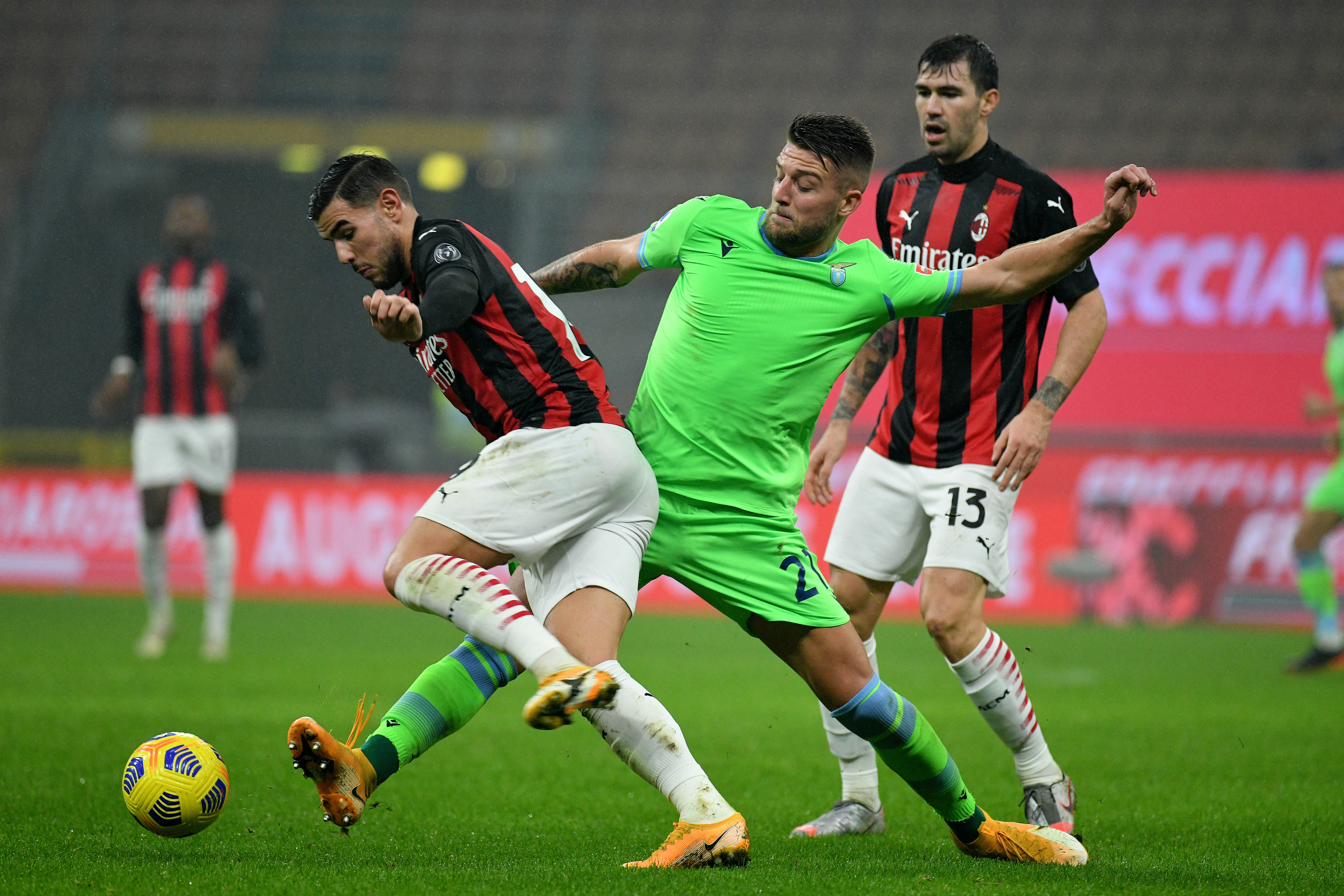MILAN, ITALY - DECEMBER 23: Sergej Milinkovic Savic of SS Lazio compete for the ball with Theo Hernandez of AC Milan during the Serie A match between AC Milan and SS Lazio at Stadio Giuseppe Meazza on December 23, 2020 in Milan, Italy. (Photo by Marco Rosi - SS Lazio/Getty Images)
