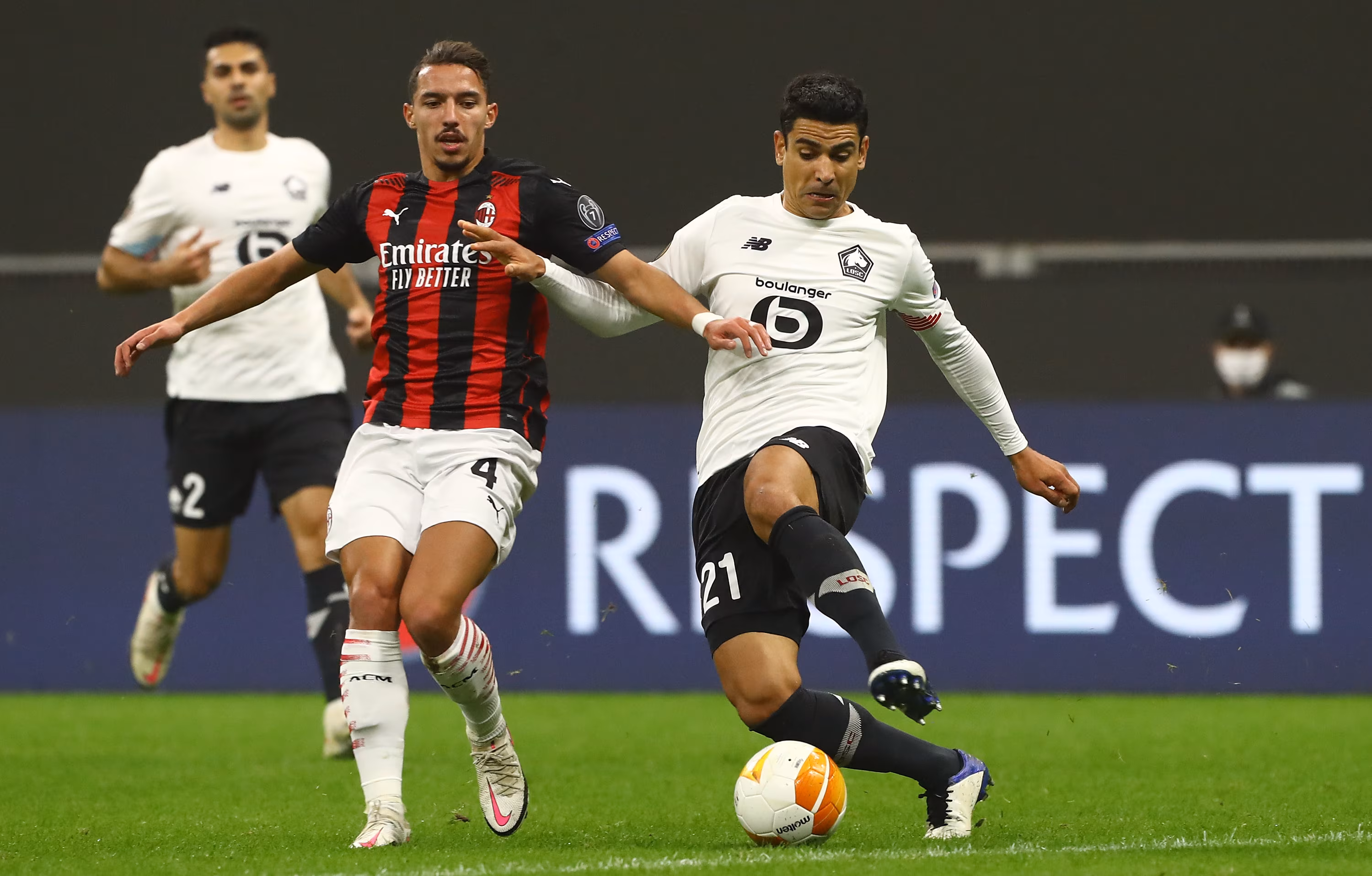MILAN, ITALY - NOVEMBER 05: Benjamin Andre (R) of LOSC Lille competes for the ball with Ismael Bennacer of AC Milan during the UEFA Europa League Group H stage match between AC Milan and LOSC Lille at San Siro Stadium on November 5, 2020 in Milan, Italy. (Photo by Marco Luzzani/Getty Images)