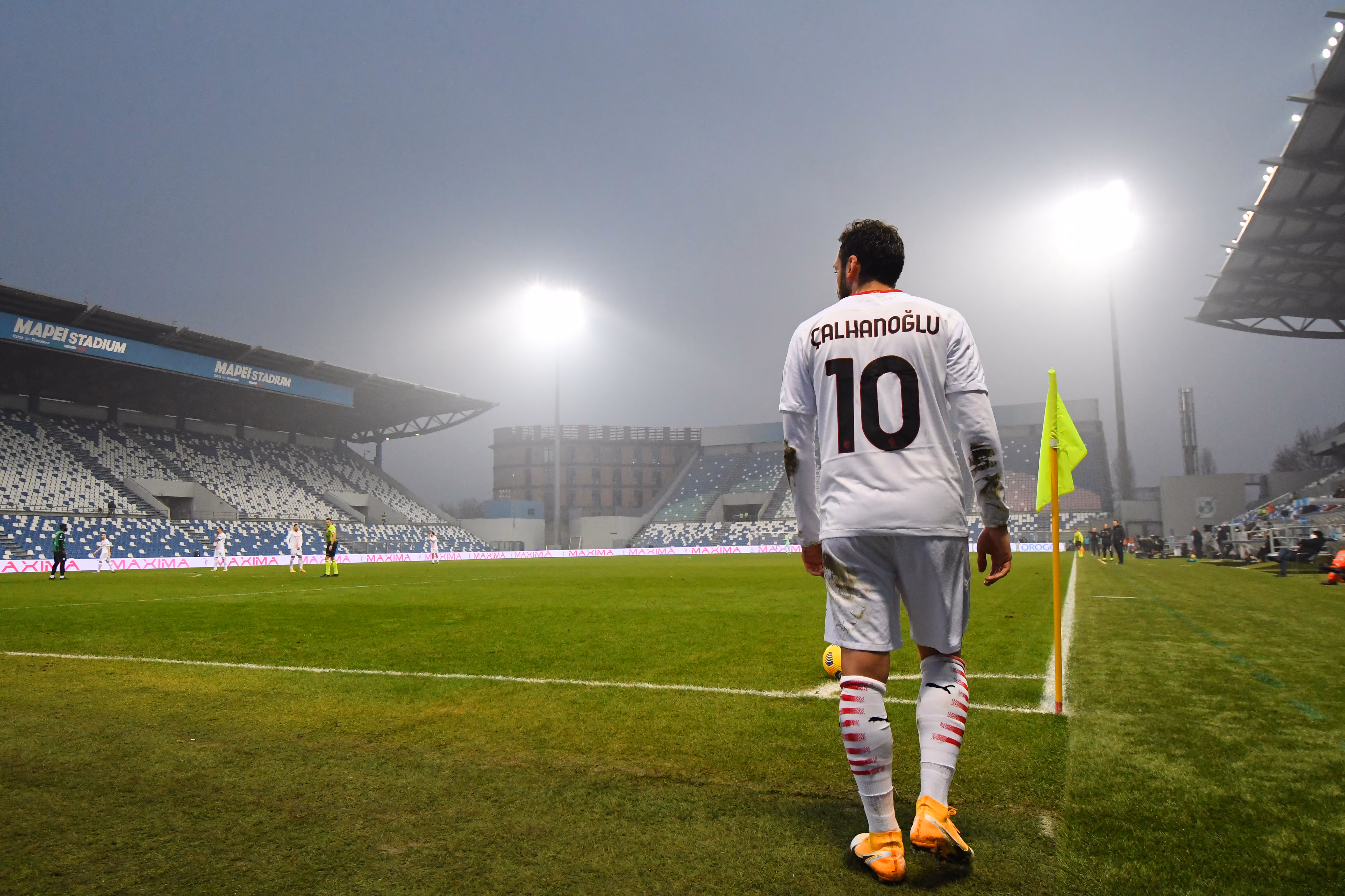 REGGIO NELL'EMILIA, ITALY - DECEMBER 20: Hakan Calhanoglu of AC Milan prepares to take a corner during the Serie A match between US Sassuolo and AC Milan at Mapei Stadium - Citta del Tricolore on December 20, 2020 in Reggio nell'Emilia, Italy. Sporting stadiums around Italy remain under strict restrictions due to the Coronavirus Pandemic as Government social distancing laws prohibit fans inside venues resulting in games being played behind closed doors. (Photo by Alessandro Sabattini/Getty Images)