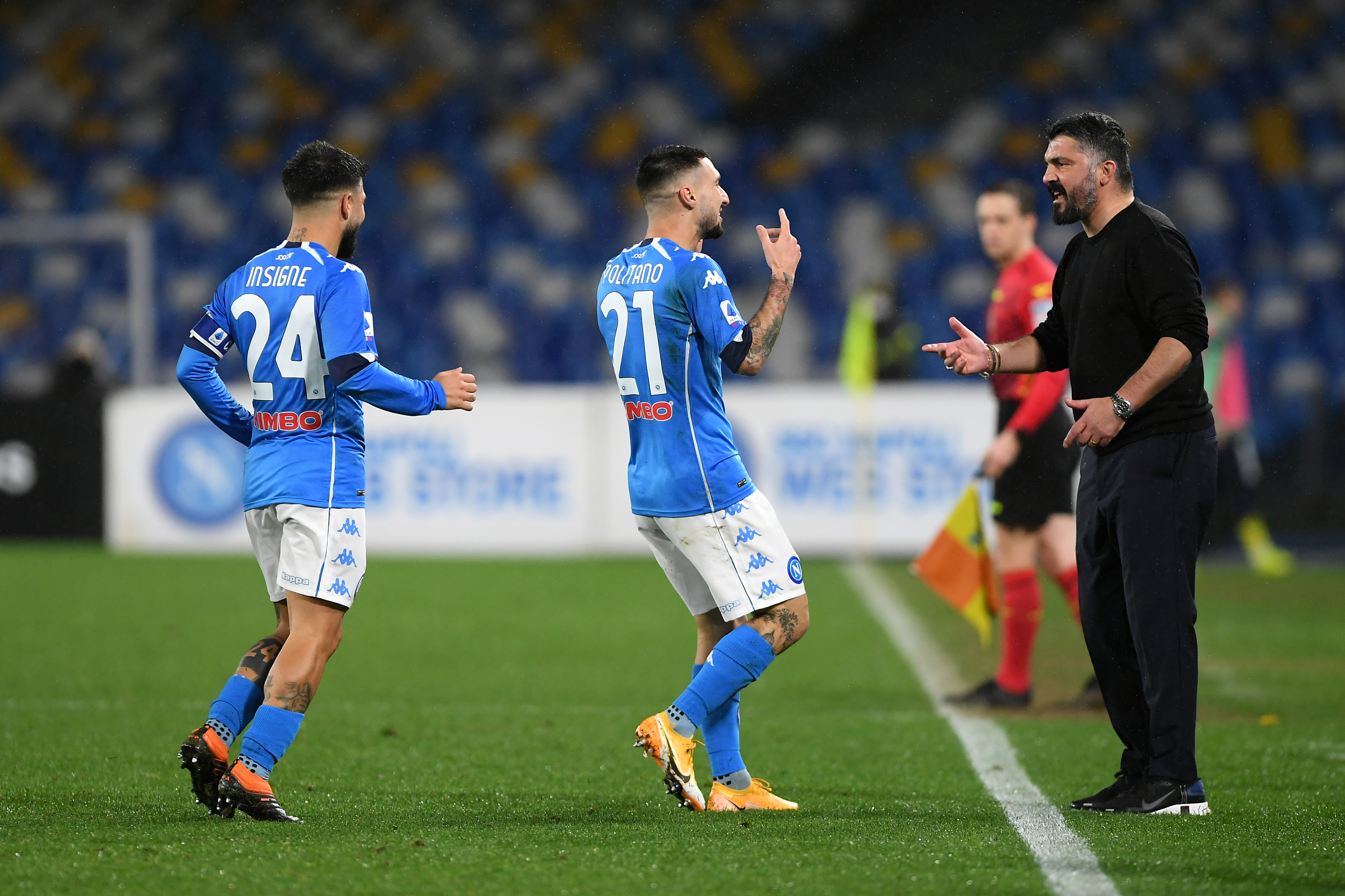 Gattuso, tecnico del Napoli, dà indicazioni a Politano e Insigne
