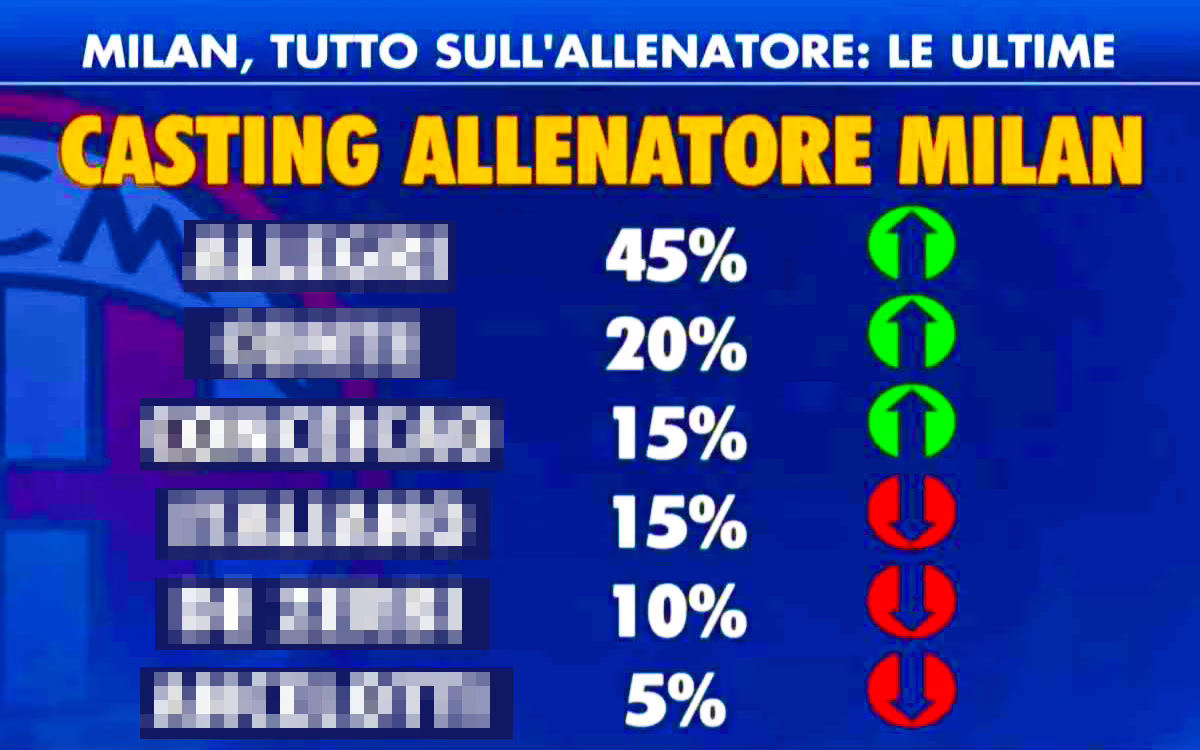 Anche noi, ad esempio, vi abbiamo proposto il nostro borsino dei possibili allenatori, tra suggestioni, nomi freddi e piste invece molto calde. In questo caso però vi proponiamo quanto risulta ai colleghi di TeleLombardia, che in diretta TV nel corso della trasmissione ‘QSVS’, hanno proposto il loro borsino dei favoriti per la panchina rossonera, che presenta anche alcuni clamorosi colpi di scena di cui parleremo e analizzeremo più avanti. Ma intanto andiamo a scoprire, nome per nome, questa speciale classifica dal nome più lontano a quello più probabile secondo TeleLombardia: iniziamo! <<<