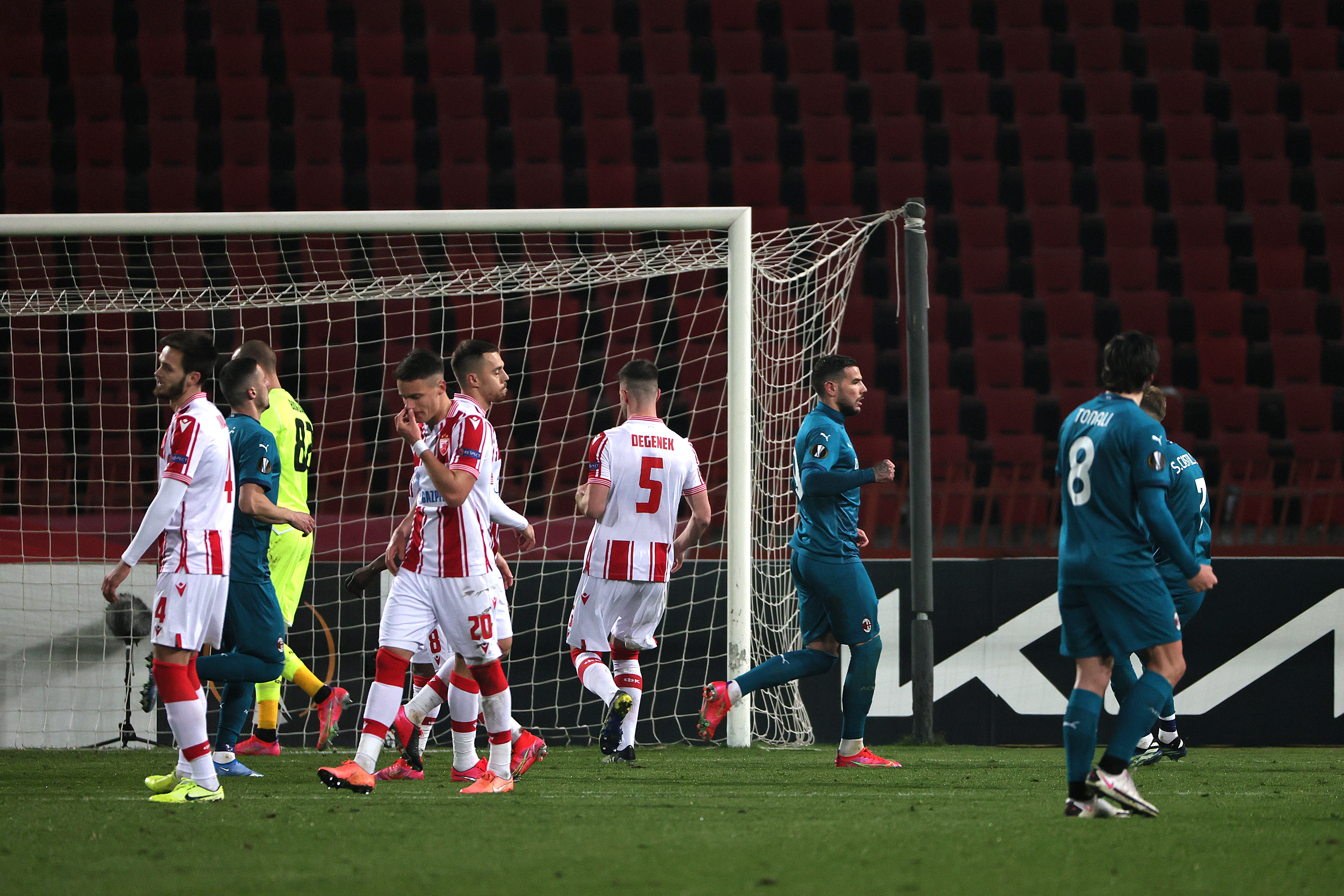 L'esultanza dei calciatori del Milan dopo il goal di Theo Hernandez alla Stella Rossa