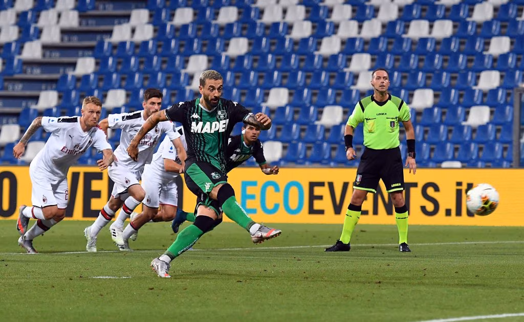 Rigore per il Sassuolo | Un braccio di Hakan Çalhanoğlu, che intercetta un cross in area, provoca il calcio di rigore che viene assegnato col Var dall’arbitro Pairetto: dalle immagini si evince che il turco tocca la sfera con il braccio sinistro e, da regolamento, il penalty è corretto.