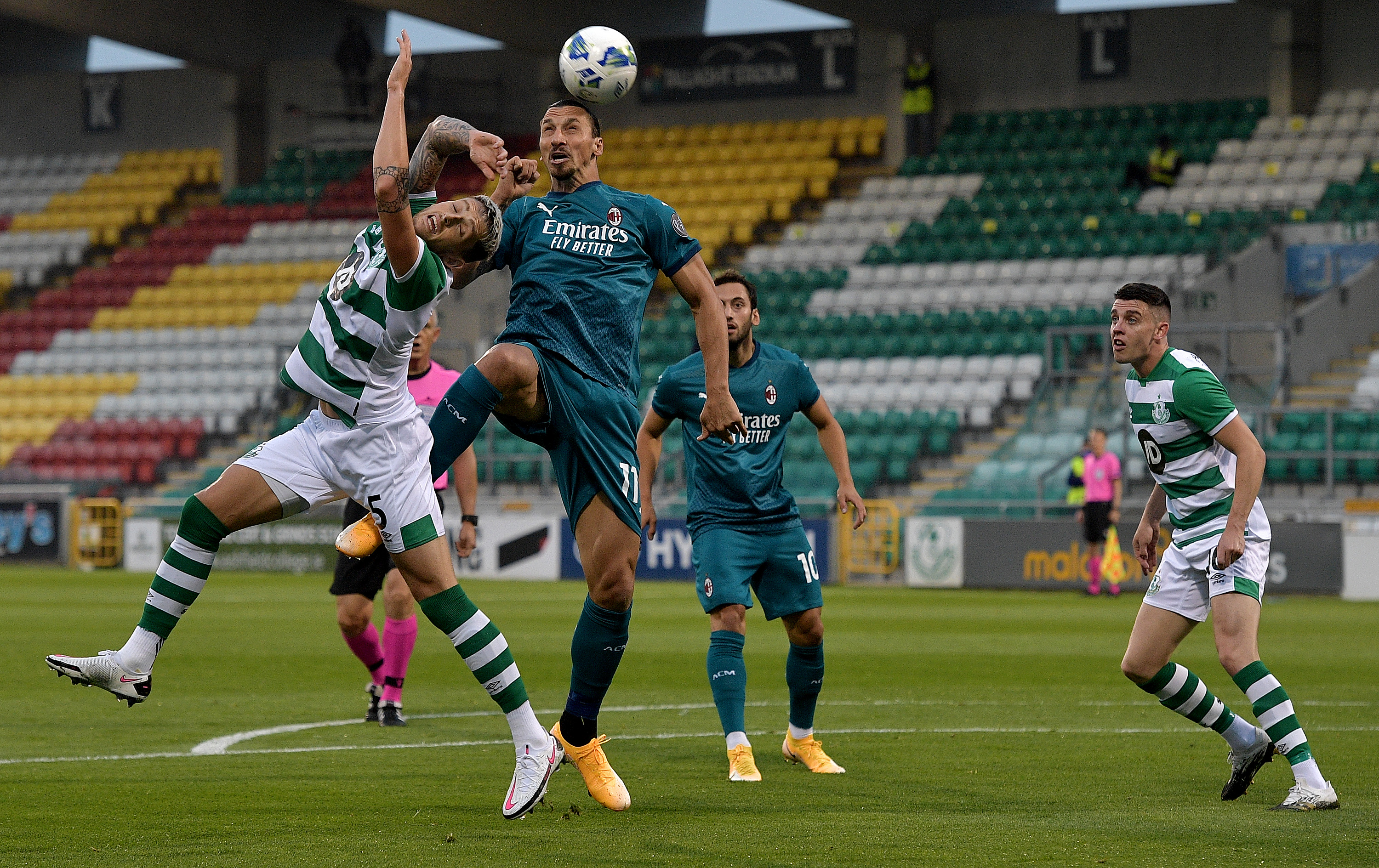TALLAGHT, IRELAND - SEPTEMBER 17: Zlatan Ibrahimovic of AC Milan competes for a header with Lee Grace of Shamrock Rovers during the UEFA Europa League second qualifying round match between Shamrock Rovers and AC Milan at Tallaght Stadium on September 17, 2020 in Tallaght, Ireland. (Photo by Charles McQuillan/Getty Images)