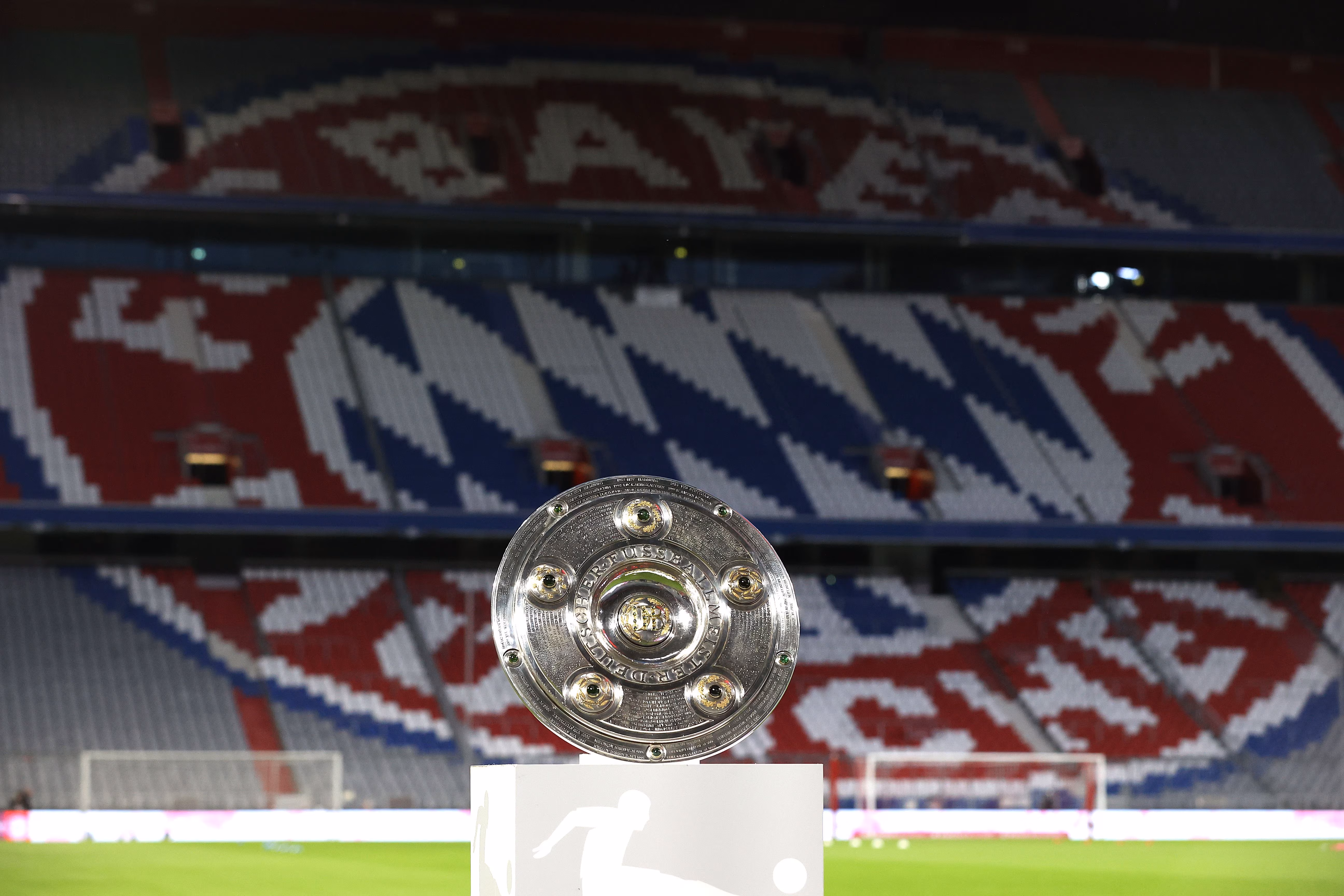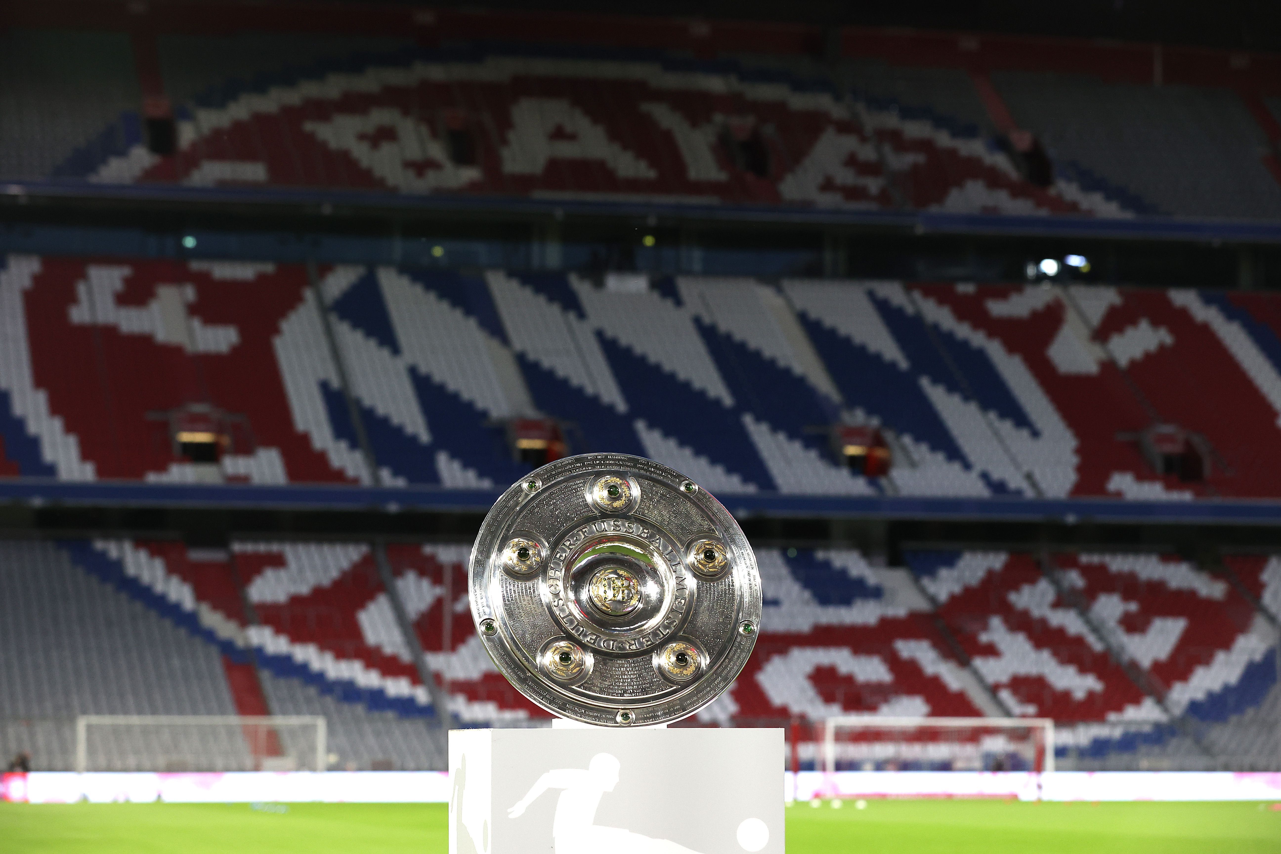 MUNICH, GERMANY - SEPTEMBER 18: The German Championhip winners trophy is displayed prior to the Bundesliga match between FC Bayern Muenchen and FC Schalke 04 at Allianz Arena on September 18, 2020 in Munich, Germany. (Photo by Alexander Hassenstein/Bongarts/Getty Images)