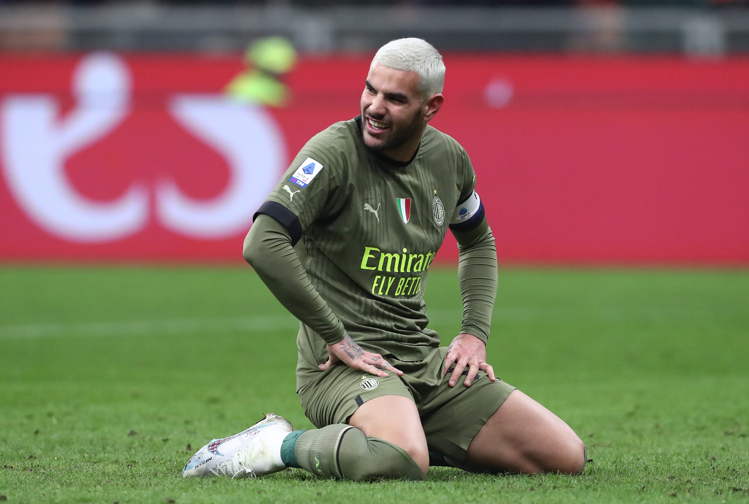 MILAN, ITALY - FEBRUARY 10: Theo Hernández of AC Milan reacts during the Serie A match between AC MIlan and Torino FC at Stadio Giuseppe Meazza on February 10, 2023 in Milan, . (Photo by Marco Luzzani/Getty Images)