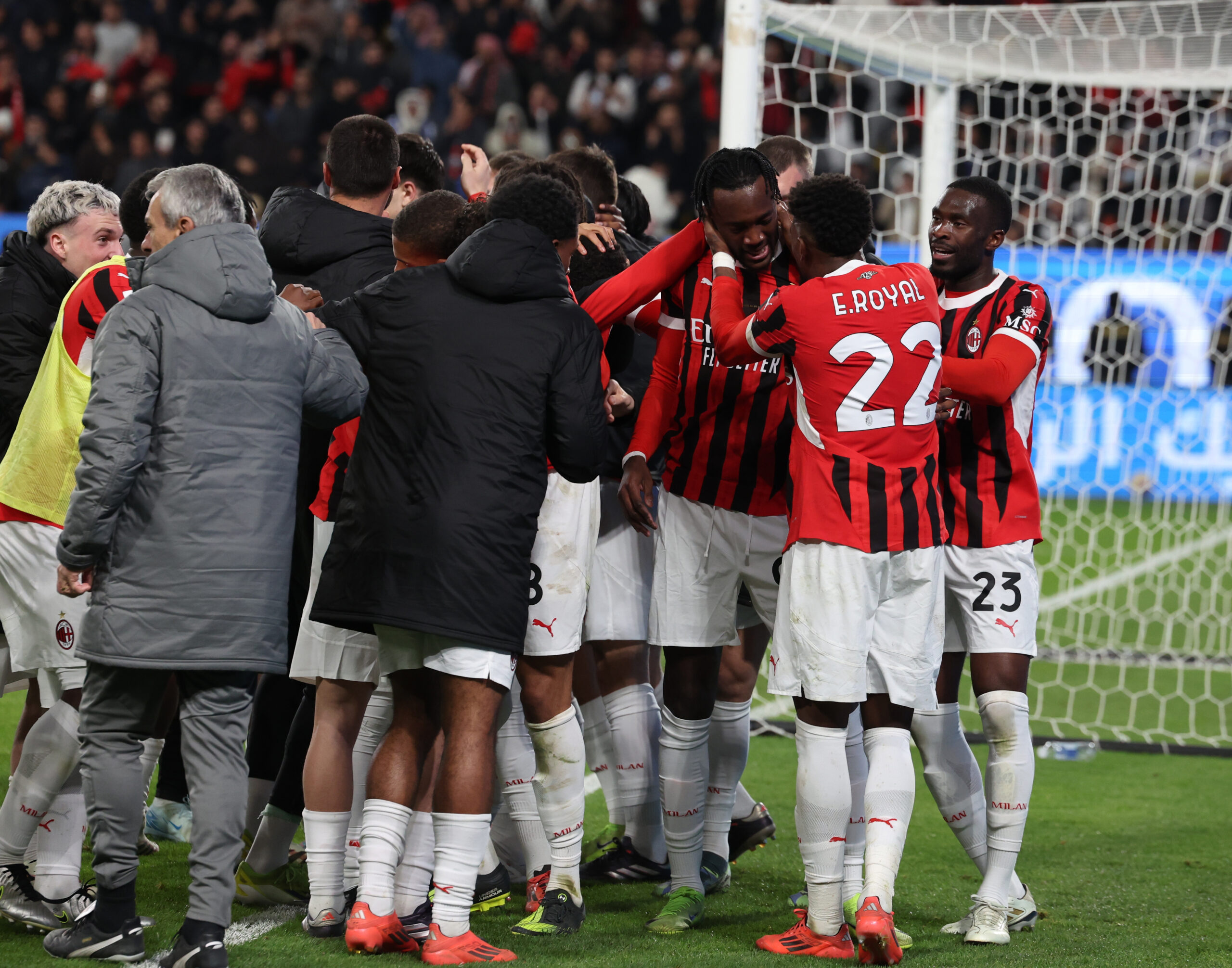 RIYADH, SAUDI ARABIA - JANUARY 06: Tammy Abraham of AC Milan celebrates with Fikayo Tomori and Emerson Royal after scoring the goal during the Italian Super Cup Final match between FC Internazionale and AC Milan at Al- Awwal Park Stadium on January 06, 2025 in Riyadh, Saudi Arabia. (Photo by Claudio Villa/AC Milan via Getty Images)