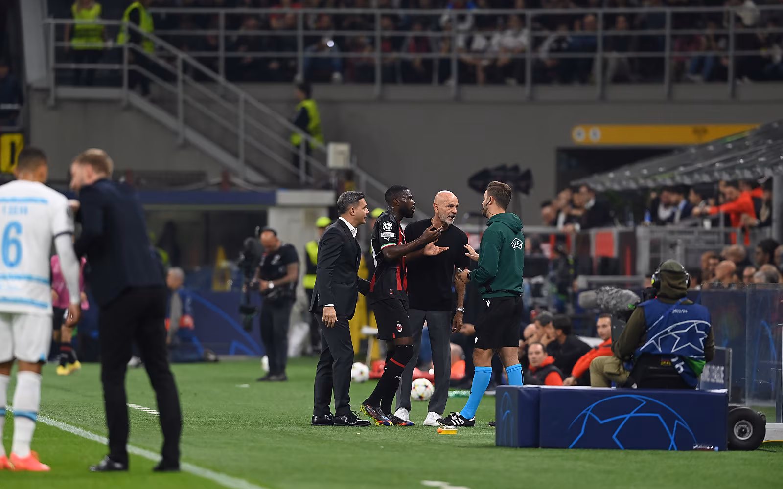 MILAN, ITALY - OCTOBER 11: Fikayo Tomori of AC Milan reacts after being shown a red card by referee Daniel Siebert during the UEFA Champions League group E match between AC Milan and Chelsea FC at Giuseppe Meazza Stadium on October 11, 2022 in Milan, Italy. (Photo by Claudio Villa/AC Milan via Getty Images)