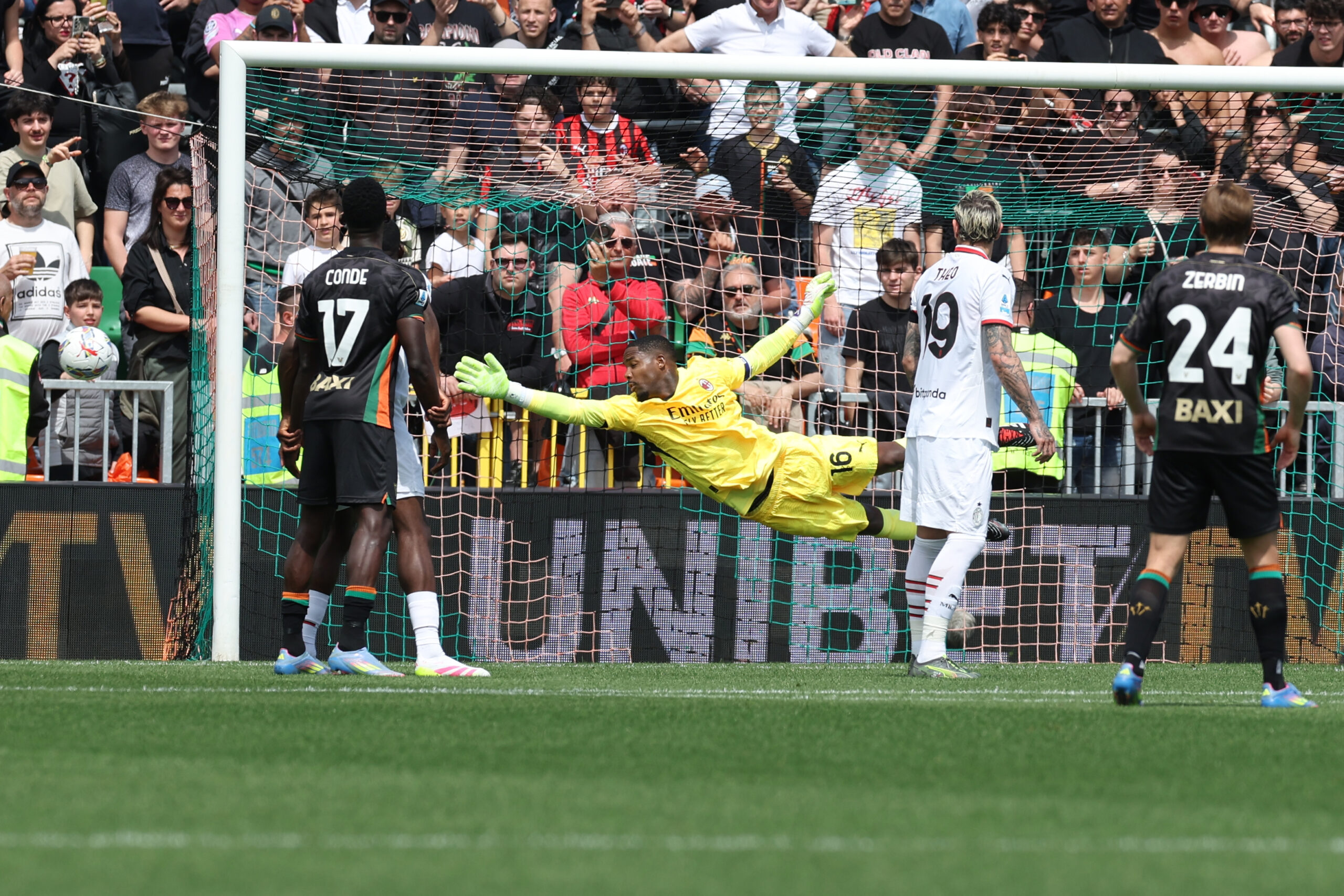 VENICE, ITALY - APRIL 27: Mike Maignan goalkeeper of AC Milan saves the ball during the Serie A match between Venezia and Milan at Stadio Pier Luigi Penzo on April 27, 2025 in Venice, Italy. (Photo by Claudio Villa/AC Milan via Getty Images)