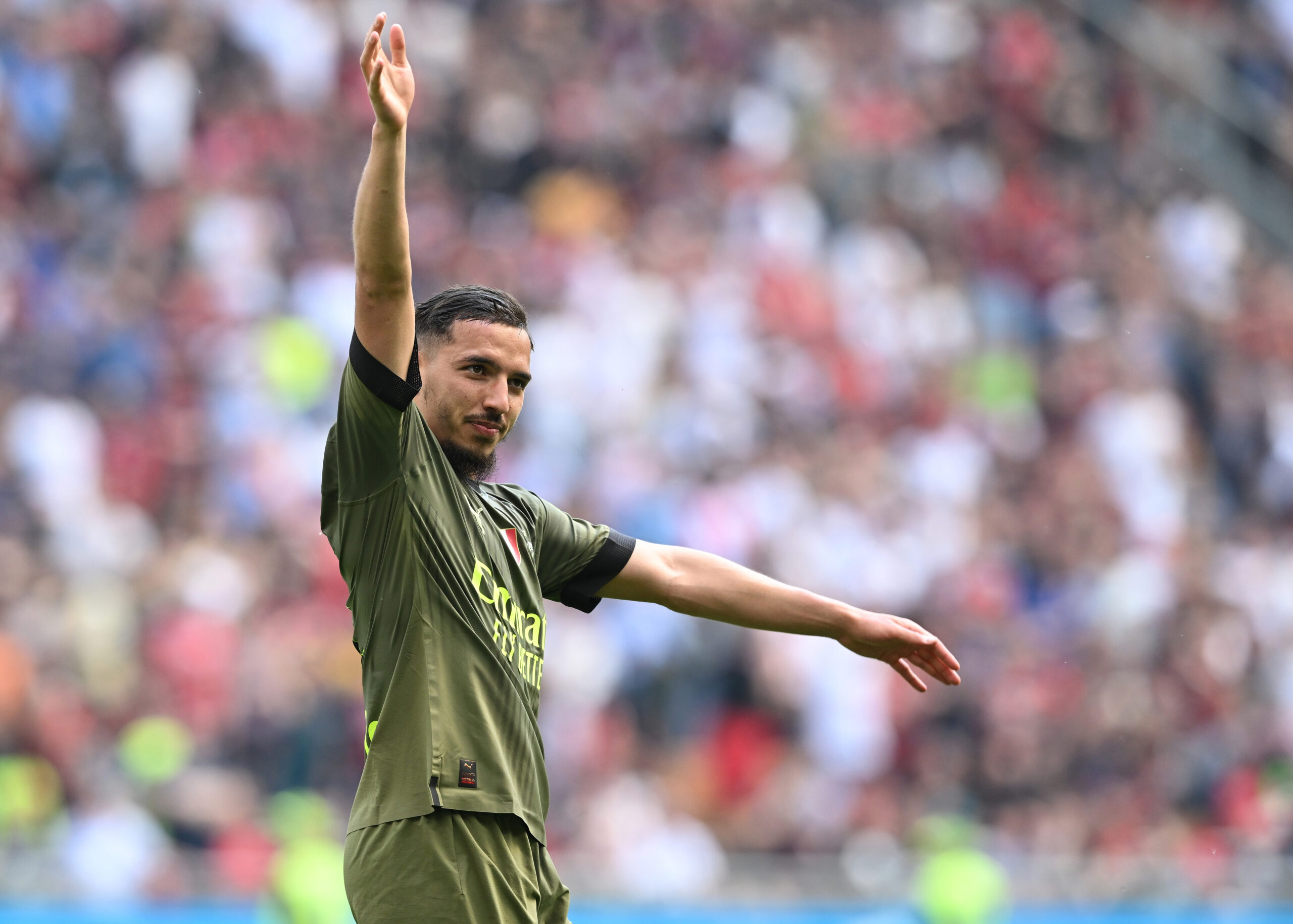 MILAN, ITALY - MAY 06: Ismael Bennacer of AC Milan celebrates after scoring the opening goal during the Serie A match between AC Milan and SS Lazio at Stadio Giuseppe Meazza on May 06, 2023 in Milan, Italy. (Photo by Claudio Villa/AC Milan via Getty Images)