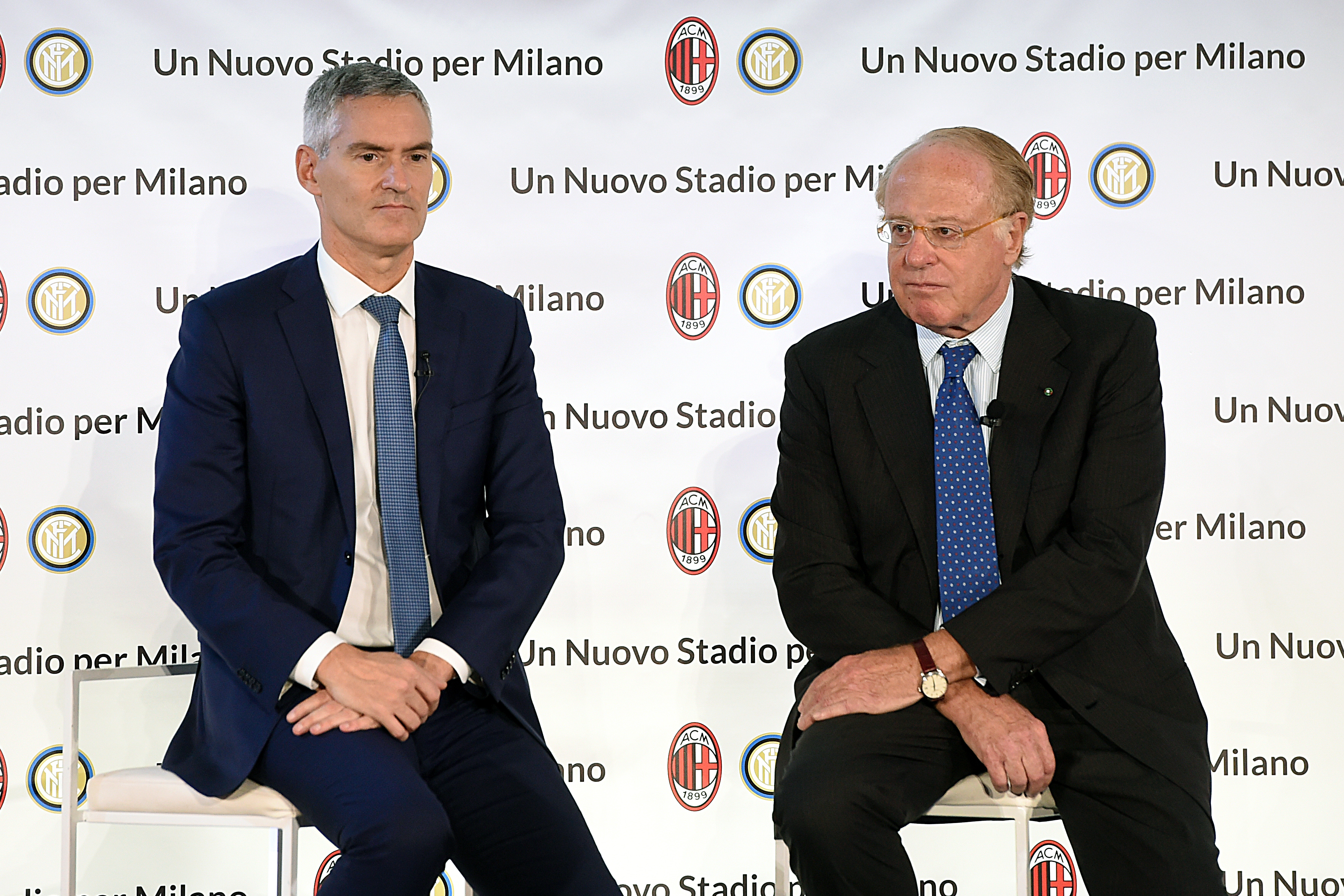 MILAN, ITALY - SEPTEMBER 26: (L - R) Alessandro Antonello, CEO of FC Inter and Paolo Scaroni President of AC Milan look on during the 'Uno Stadio Per Milano' Conference on September 26, 2019 in Milan, Italy. (Photo by Pier Marco Tacca - Inter/Inter via Getty Images)