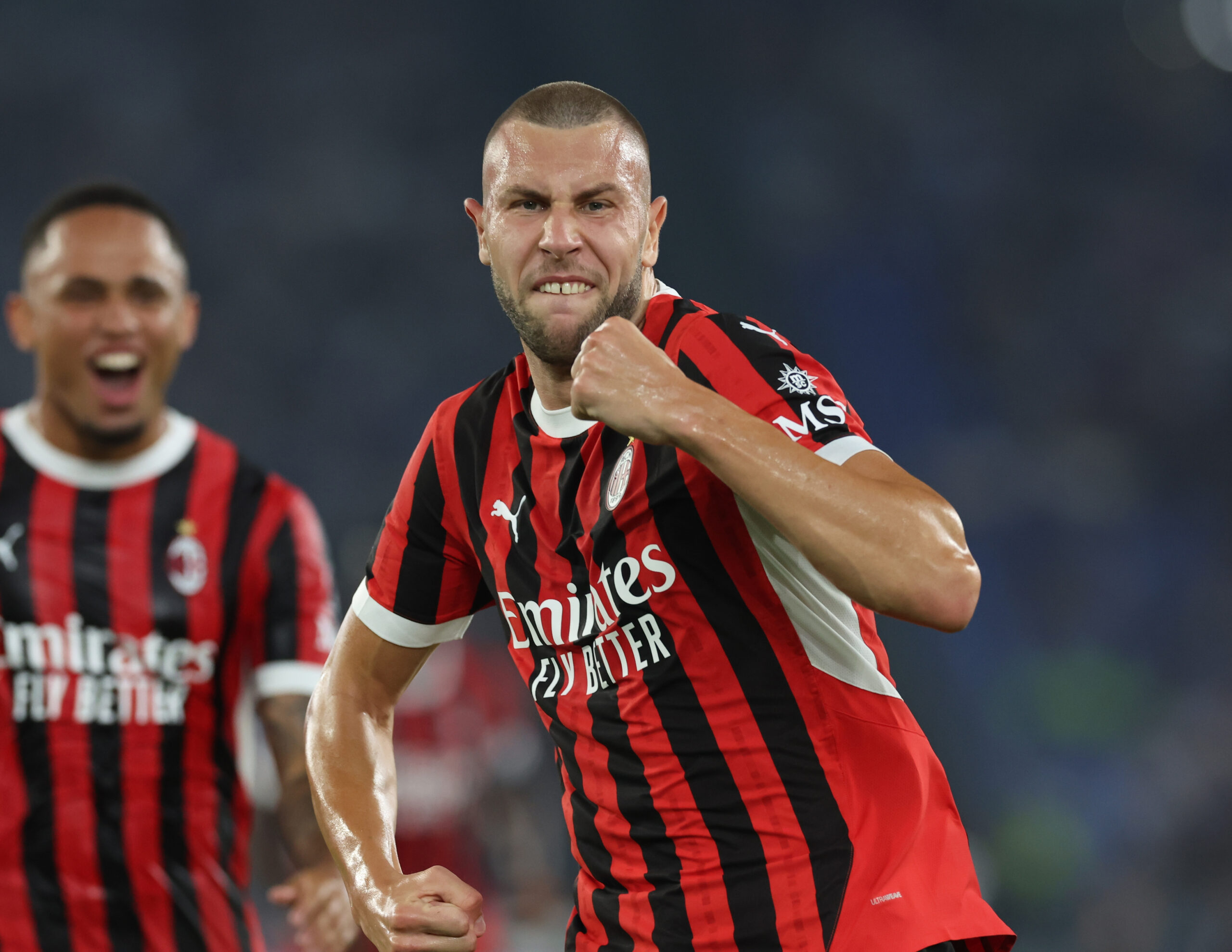 ROME, ITALY - AUGUST 31: Strahinja Pavlovic of AC Milan celebrates after scoring the goal during the Serie match between Lazio and Milan at Stadio Olimpico on August 31, 2024 in Rome, Italy. (Photo by Claudio Villa/AC Milan via Getty Images)