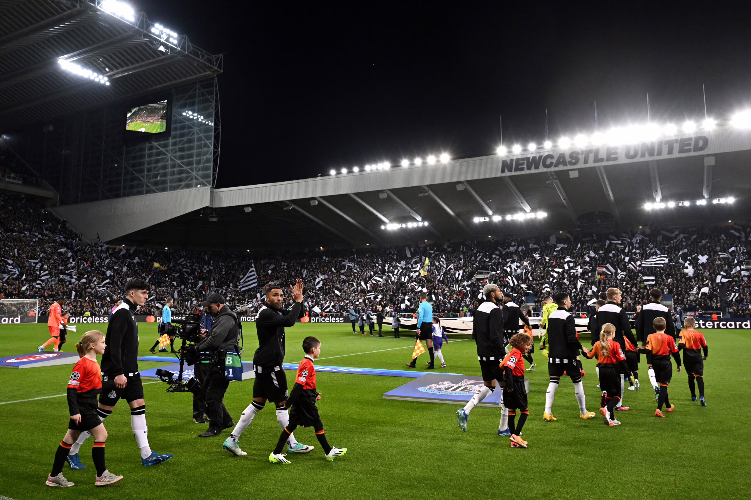 NEWCASTLE UPON TYNE, ENGLAND - DECEMBER 13: Callum Wilson of Newcastle United applauds the fans as he walks out onto the pitch with teammates prior to the UEFA Champions League match between Newcastle United FC and AC Milan at St. James Park on December 13, 2023 in Newcastle upon Tyne, England. (Photo by Stu Forster/Getty Images)