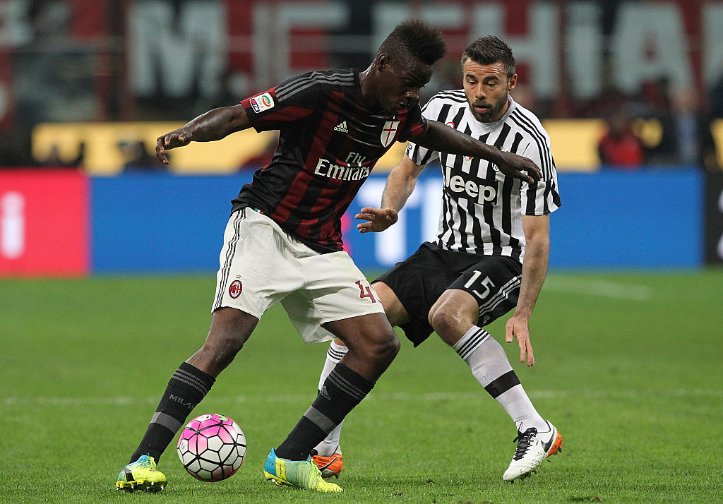 MILAN, ITALY - APRIL 09: Mario Balotelli of AC Milan is challenged by Andrea Barzagli of Juventus FC during the Serie A match between AC Milan and Juventus FC at Stadio Giuseppe Meazza on April 9, 2016 in Milan, Italy. (Photo by Marco Luzzani/Getty Images)