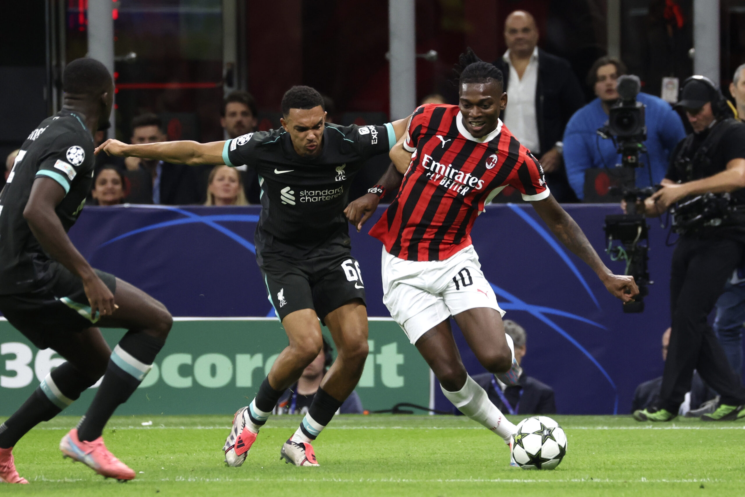 MILAN, ITALY - SEPTEMBER 17: Rafael Leao of AC Milan competes for the ball with Trent Alexander-Arnold of Liverpool FC during the UEFA Champions League 2024/25 League Phase MD1 match between AC Milan and Liverpool FC at Stadio San Siro on September 17, 2024 in Milan, Italy. (Photo by Giuseppe Cottini/AC Milan via Getty Images)