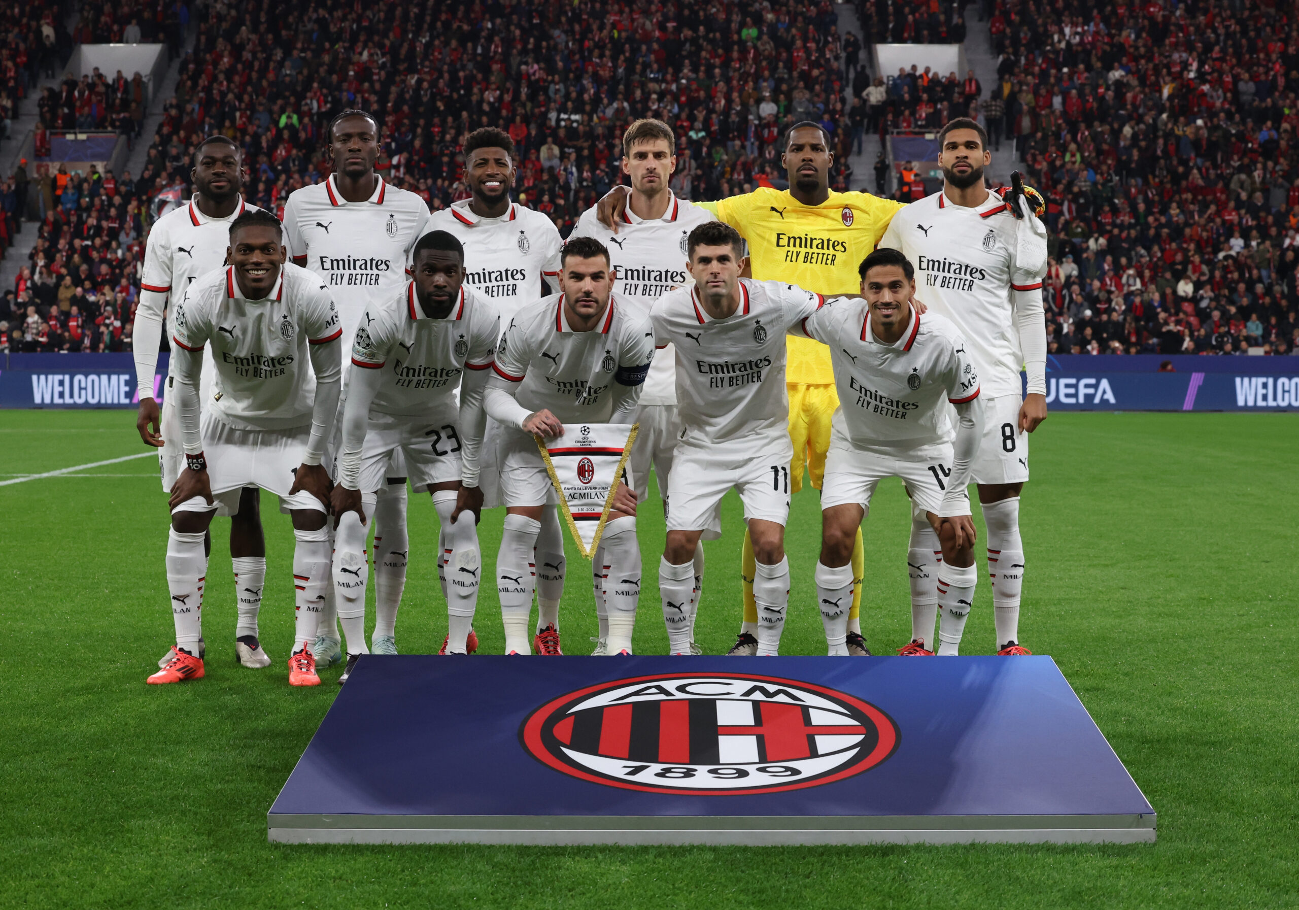 LEVERKUSEN, GERMANY - OCTOBER 01: Players of AC Milan line up prior to the UEFA Champions League 2024/25 League Phase MD2 match between Bayer 04 Leverkusen and AC Milan at BayArena on October 01, 2024 in Leverkusen, Germany. (Photo by Claudio Villa/AC Milan via Getty Images)