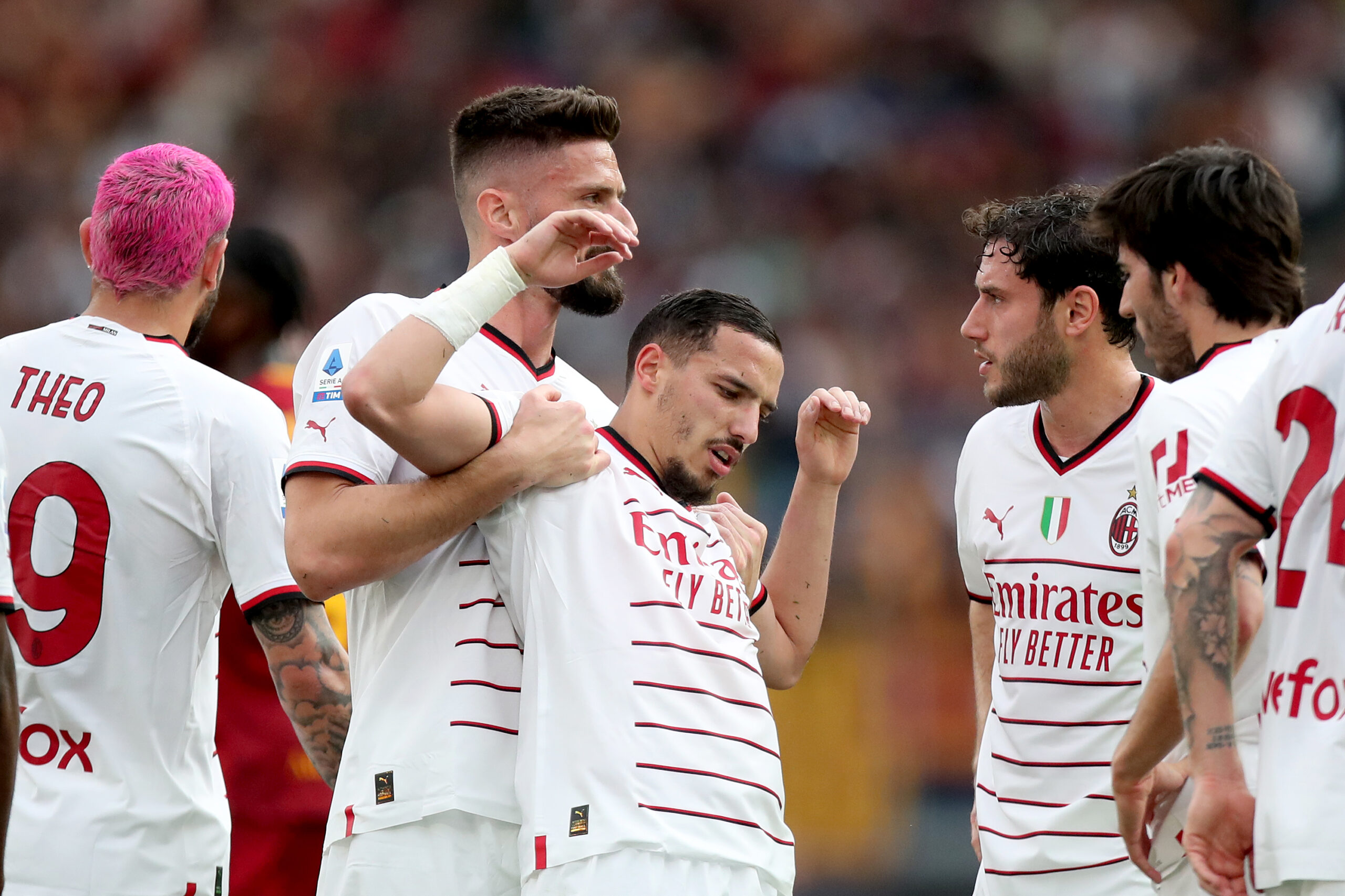 ROME, ITALY - APRIL 29: Ismael Bennacer of AC Milan is held back by teammate Olivier Giroud during the Serie A match between AS Roma and AC Milan at Stadio Olimpico on April 29, 2023 in Rome, Italy. (Photo by Paolo Bruno/Getty Images)